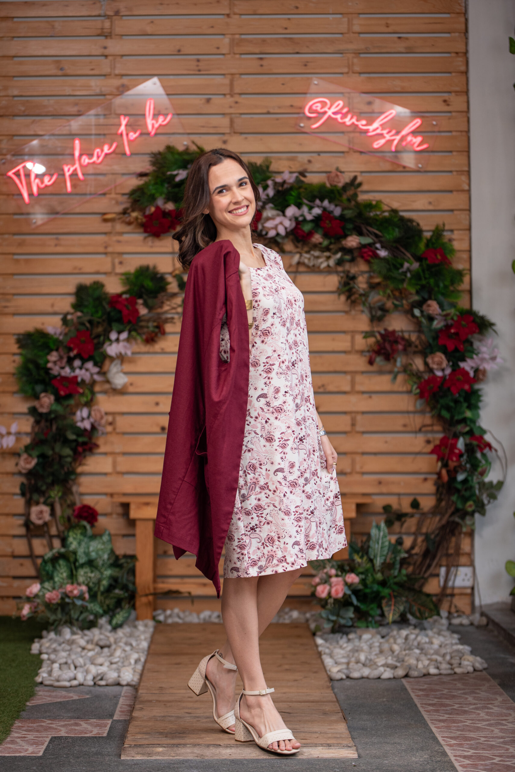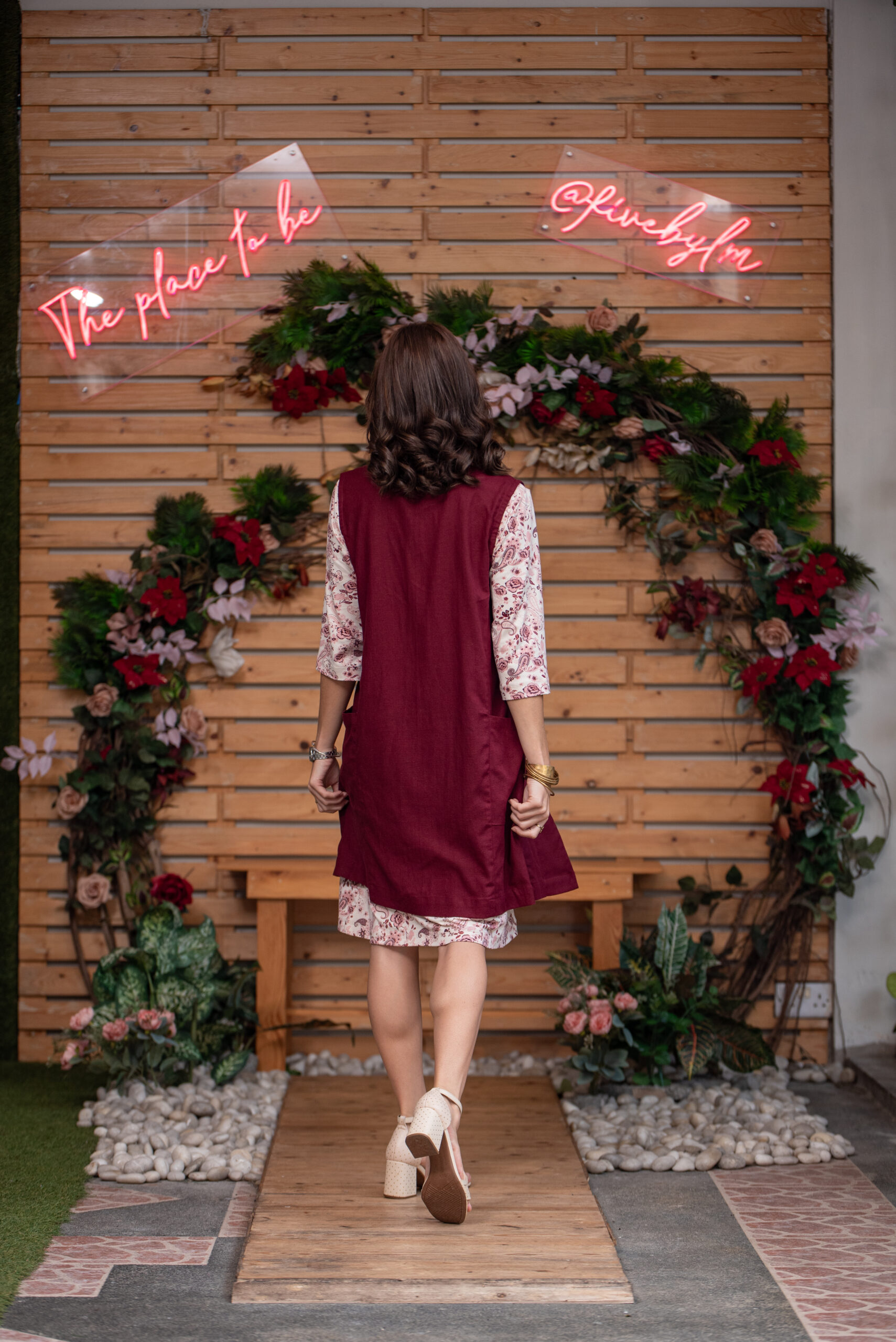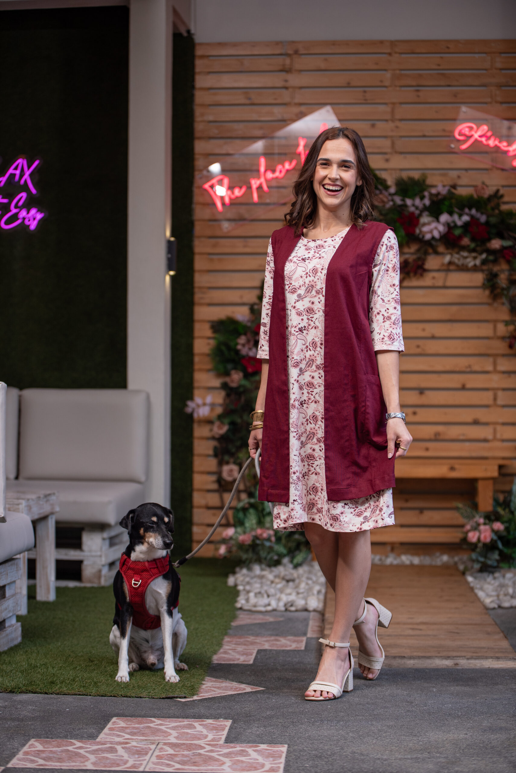 Discover our warm and cozy Amanda knitted dress in soft viscose jersey, featuring a beautiful beige and burgundy floral print. This elegant dress is perfectly paired with a long burgundy waistcoat for a stylish and sophisticated look.