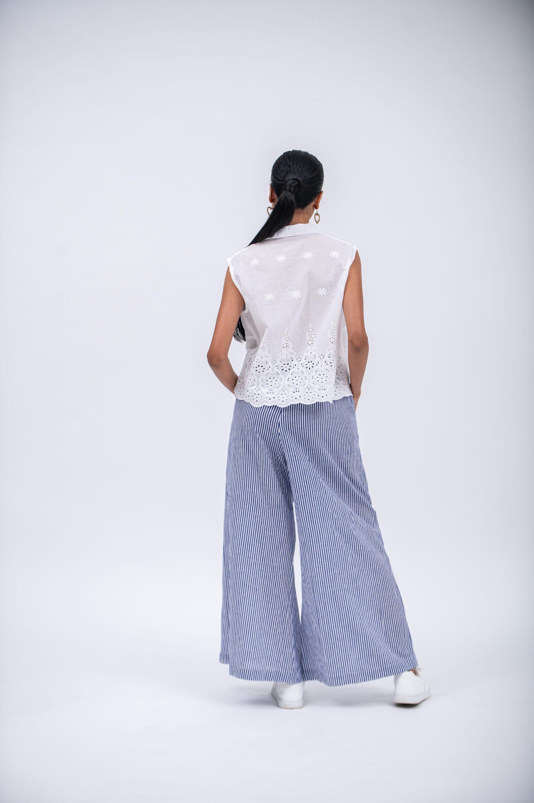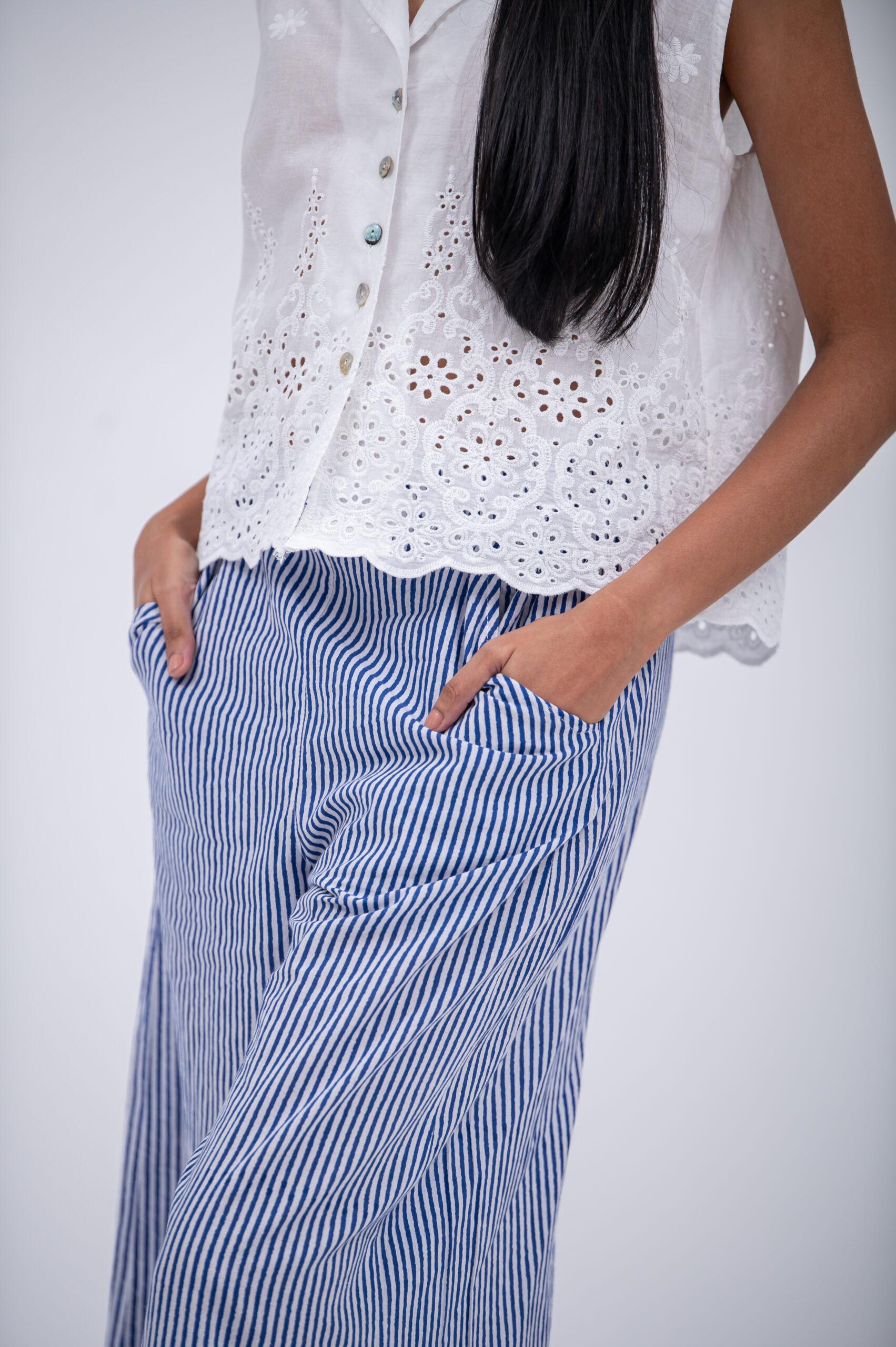 The Ava top is a fresh short sleeveless top in broderie anglaise, designed for effortless summer style. It features a revers collar and a delicate border detail that adds texture and charm. Light, breathable, and easy to pair, the Ava top is perfect with linen pants, skirts, or shorts for warm days.