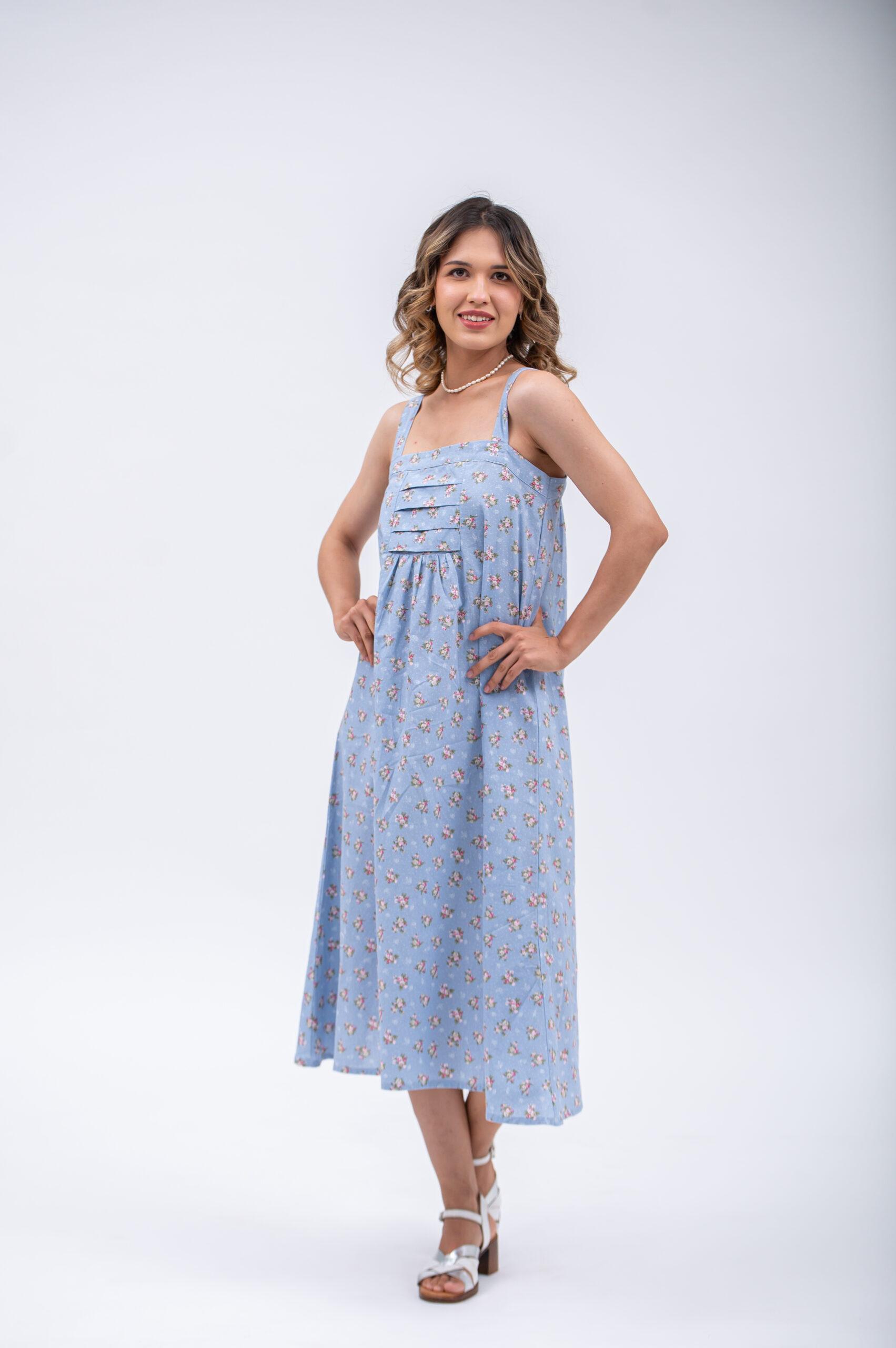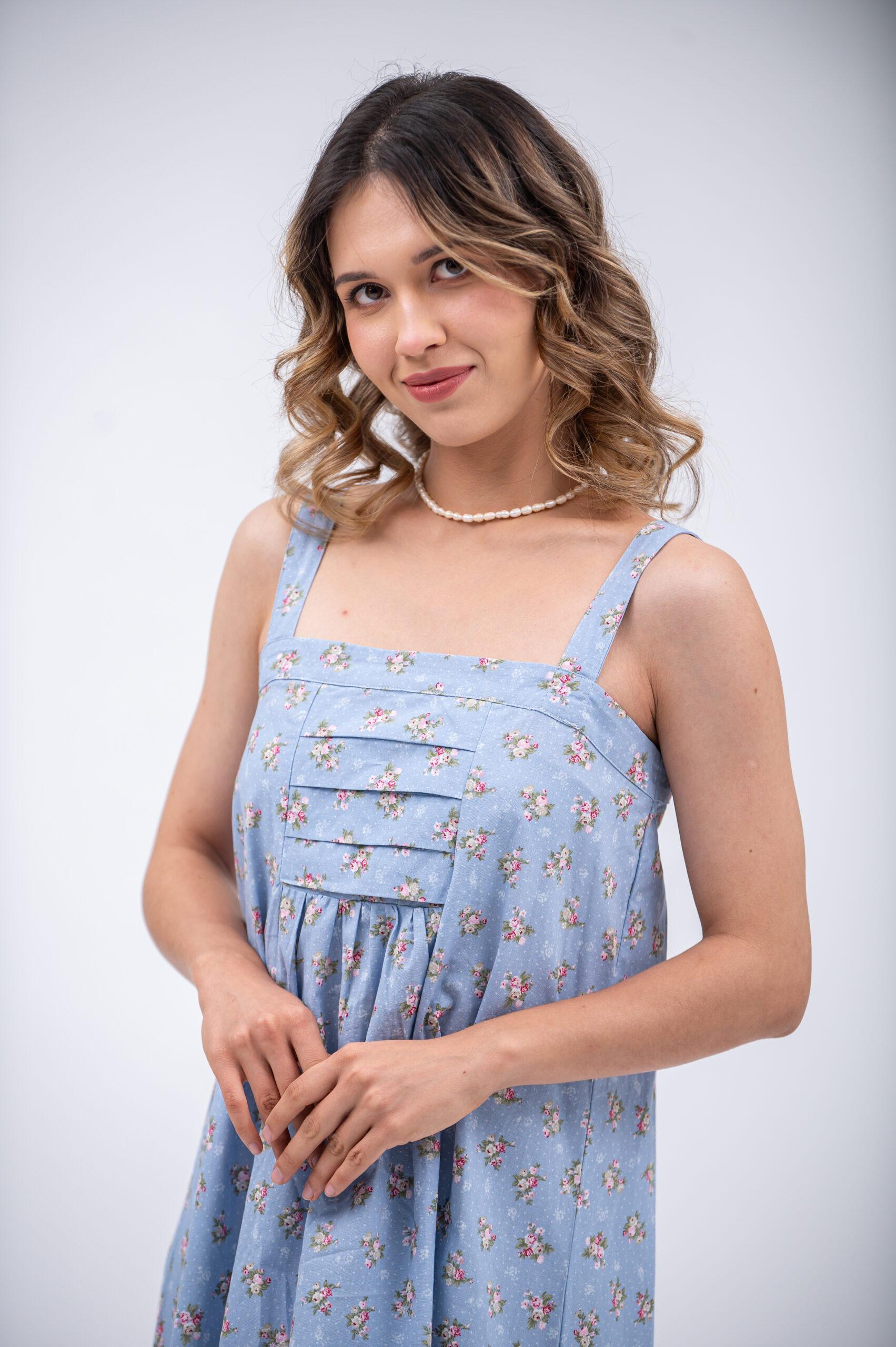 The Beatrice dress is a graceful midi dress in lightweight blue ditsy print linen. Designed with large straps and a beautiful pleated yoke at the front, it offers a flattering and comfortable silhouette. Breathable and easy to wear, this linen dress is perfect for warm days and relaxed summer style.