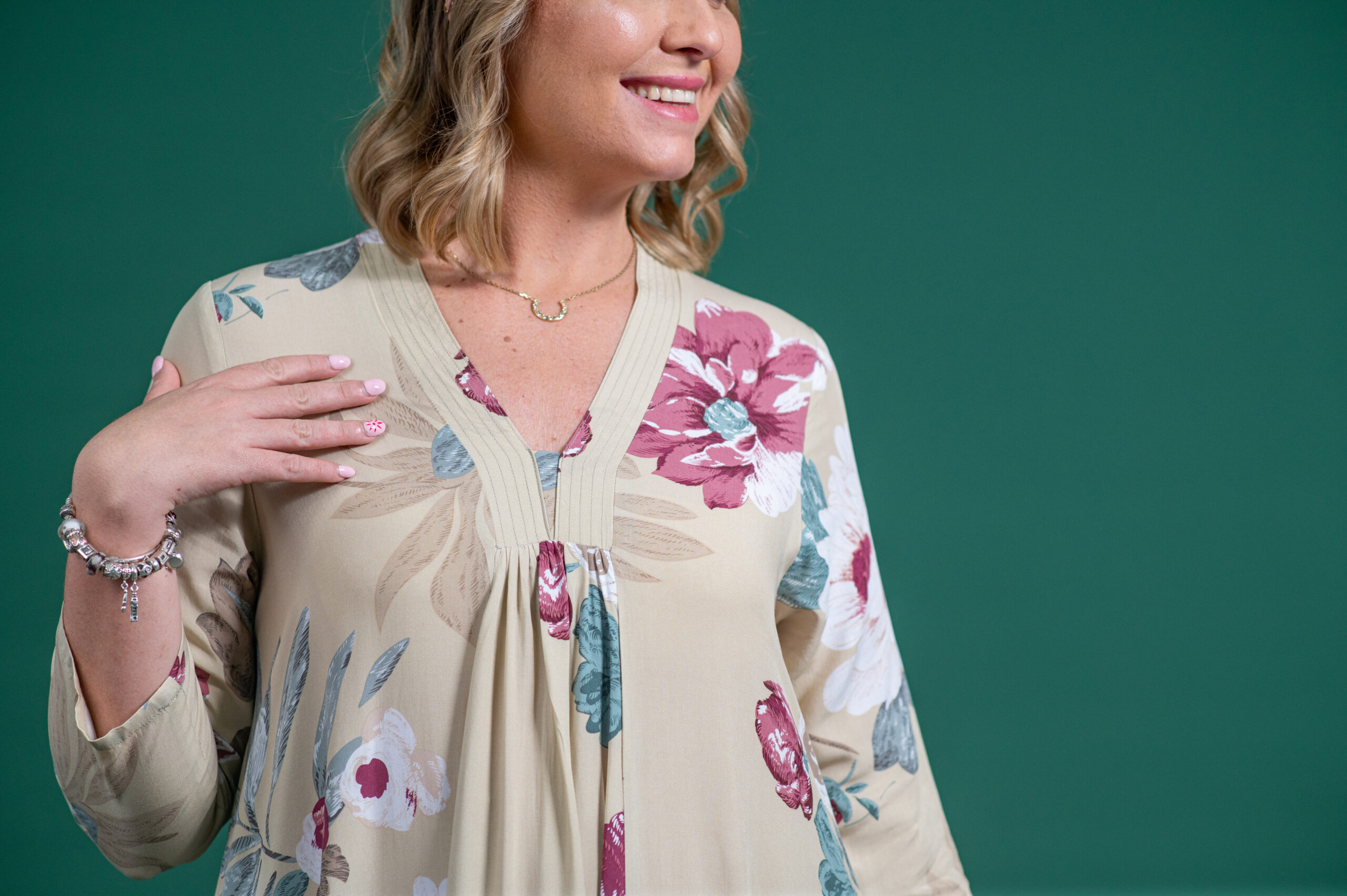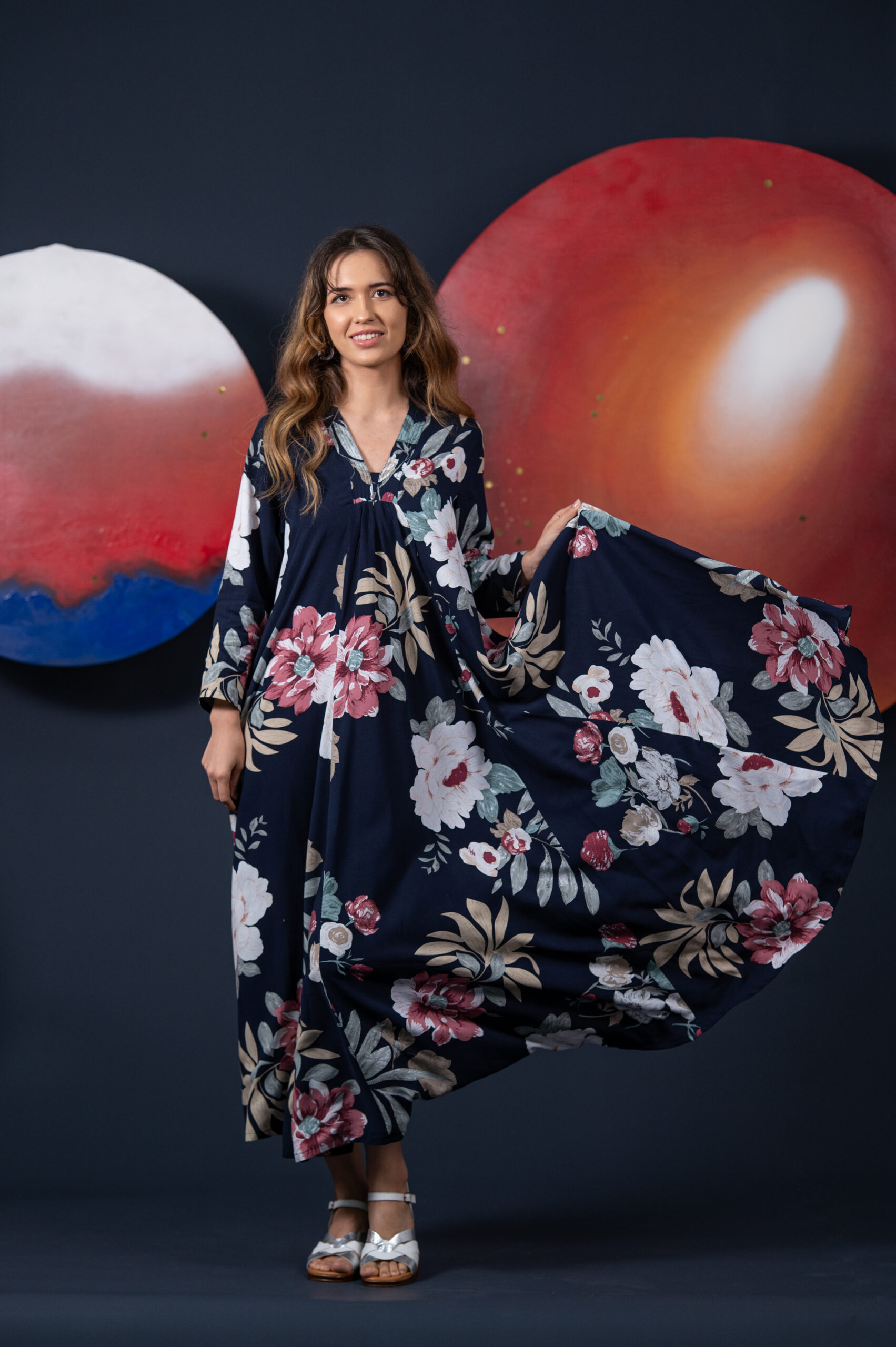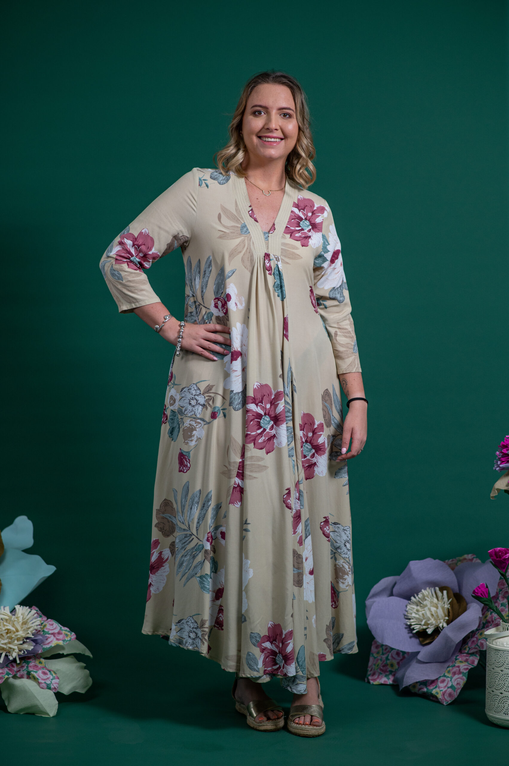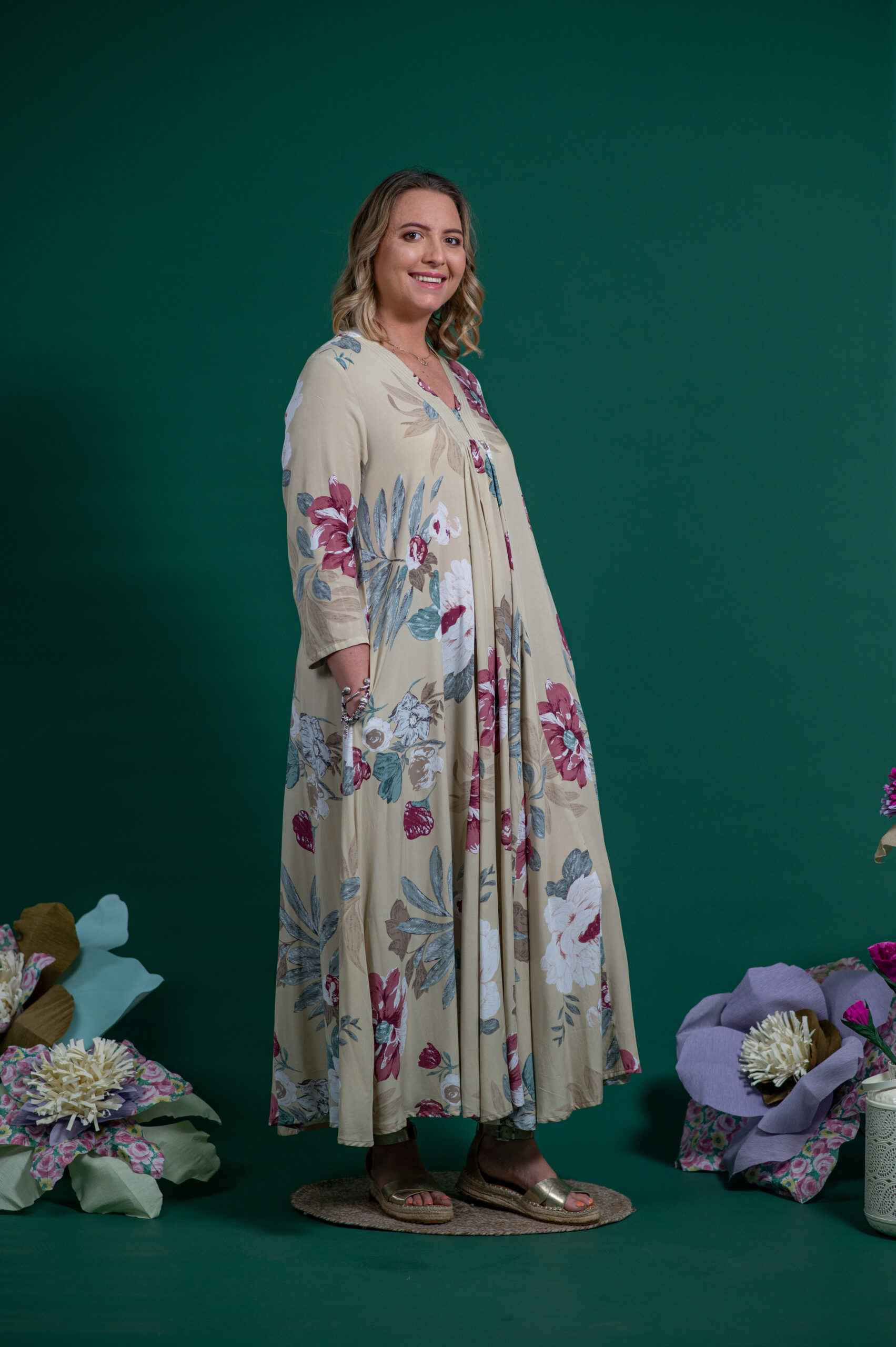 The Carolyne Dress is a long, flowy maxi crafted in a soft floral fabric. Featuring a V-neckline with a neckband, elegant panel detailing, and practical pockets, it’s designed to offer both ease and grace. A timeless piece that moves with you — naturally.