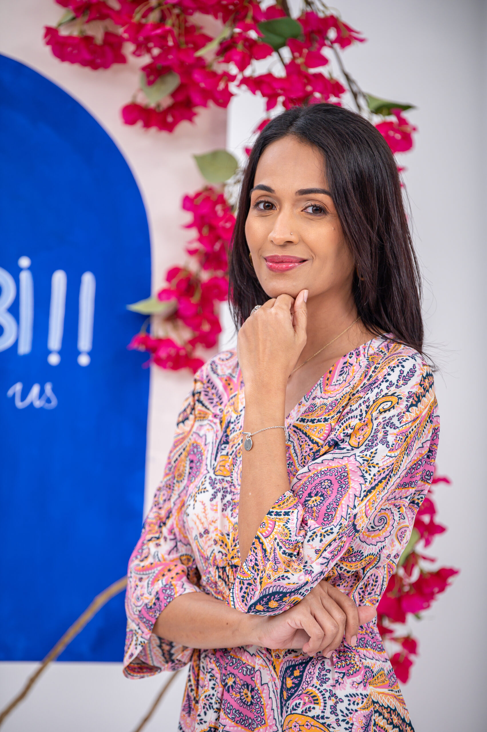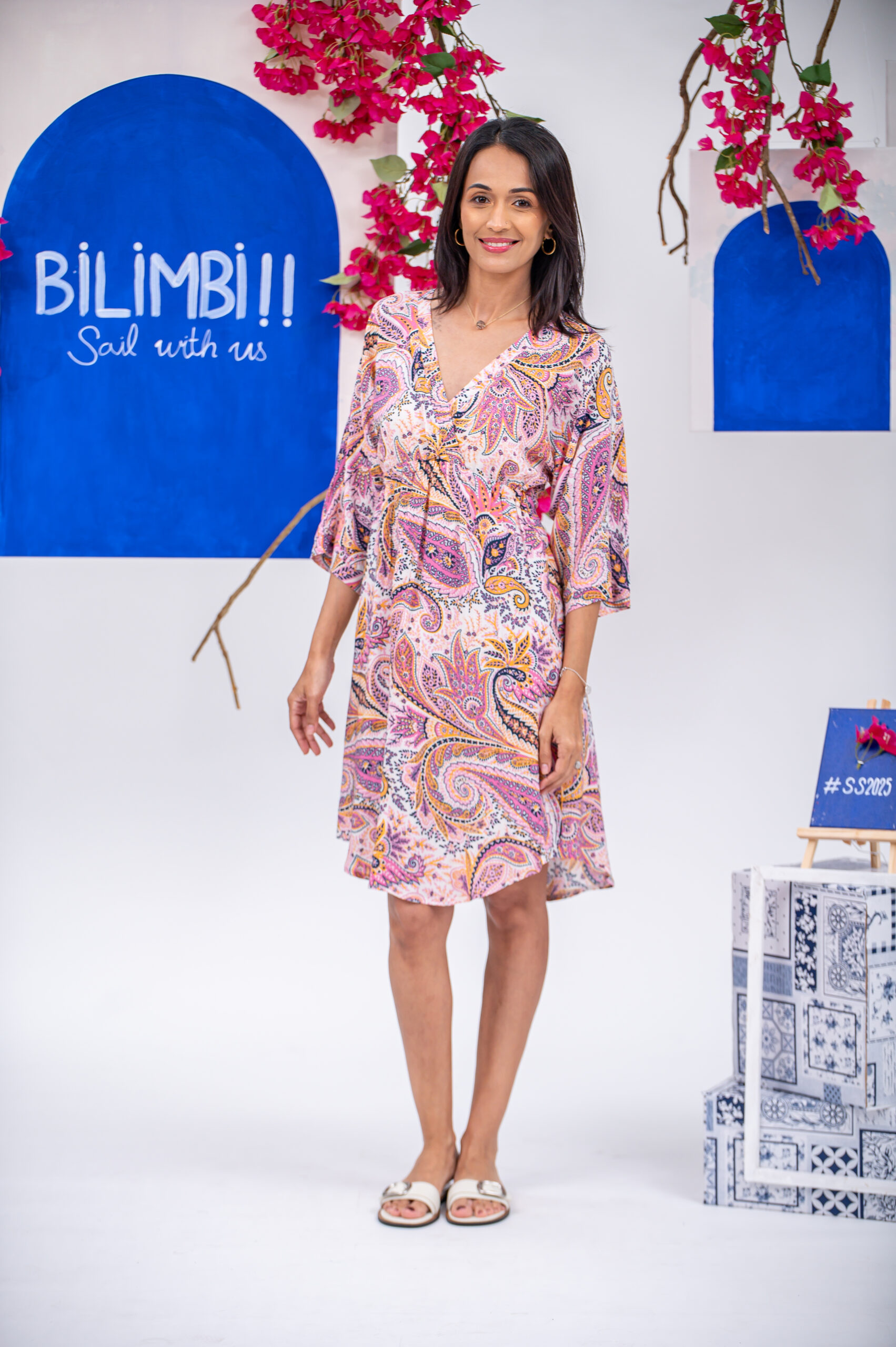 Fuchsia, yellow and navy hues blend in harmony, for a look that feels joyful and free.