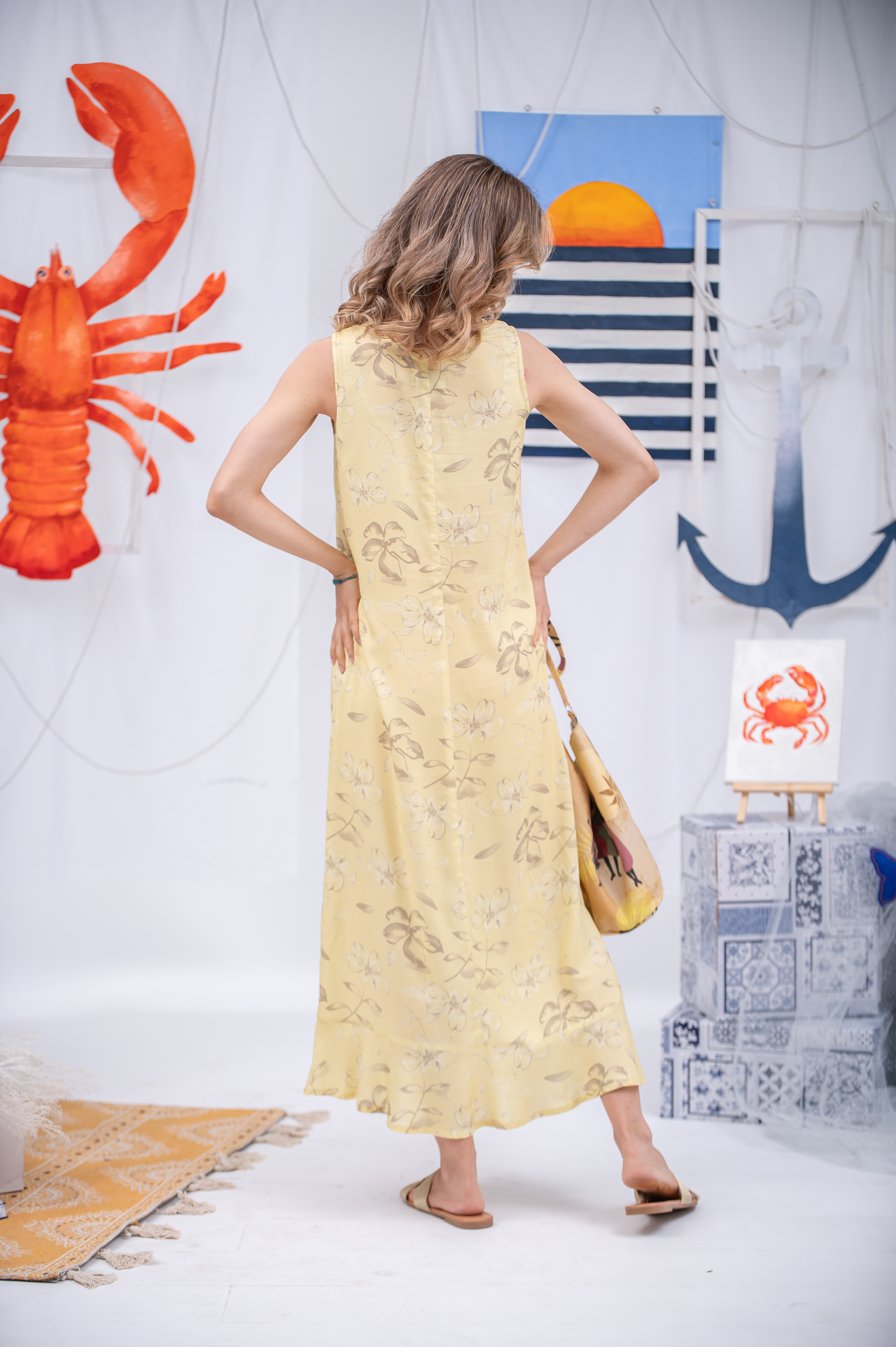 A sleeveless straight dress crafted in soft floral rayon, designed with a round neckline and subtle bust darts for a flattering fit. Finished with a delicate flounce at the hem, Danae brings effortless charm and feminine movement to warm-weather days.
