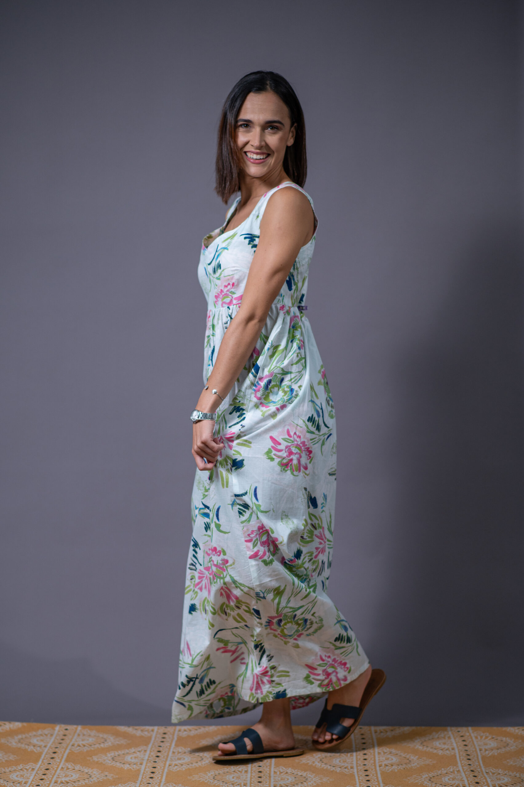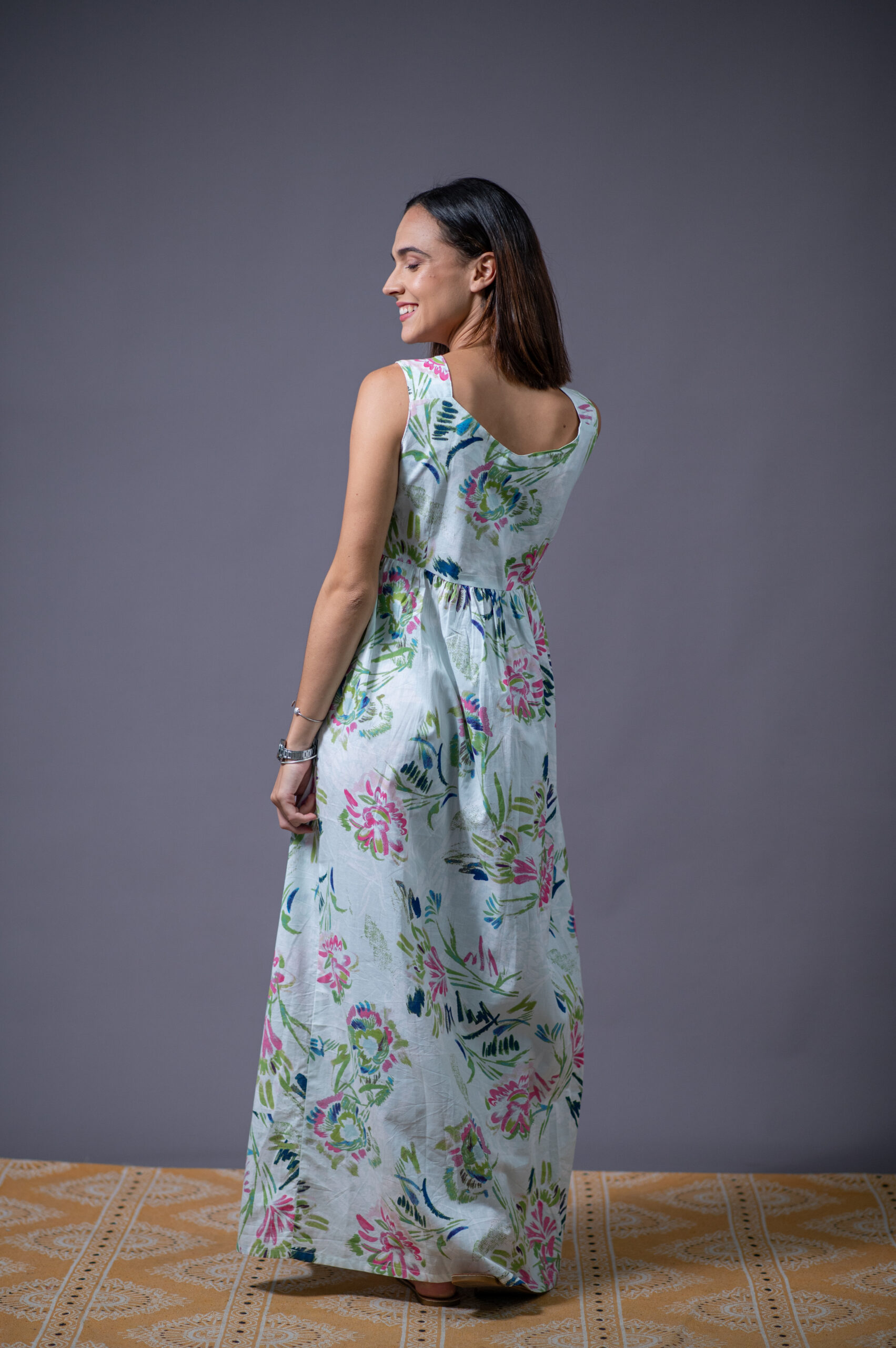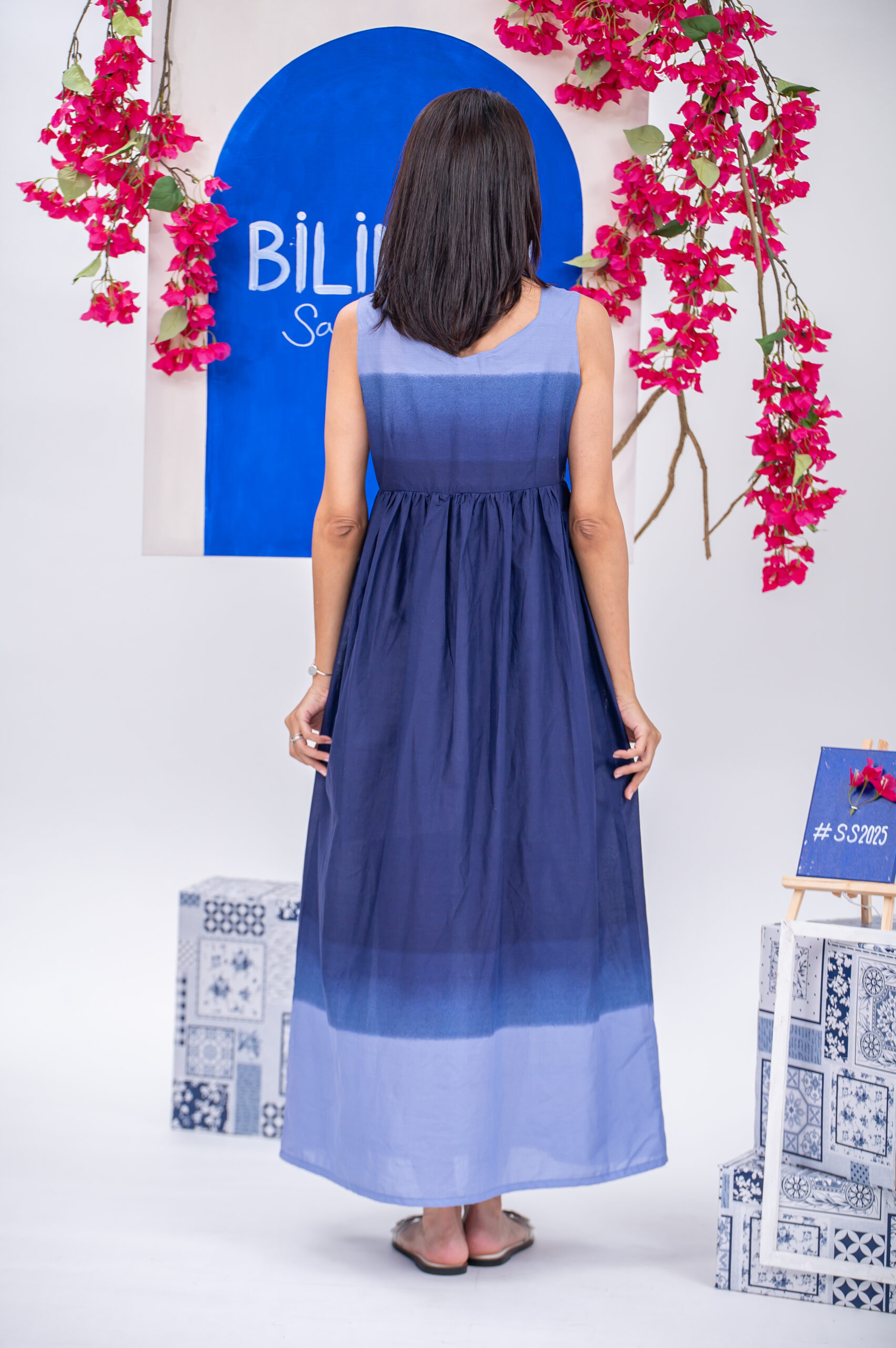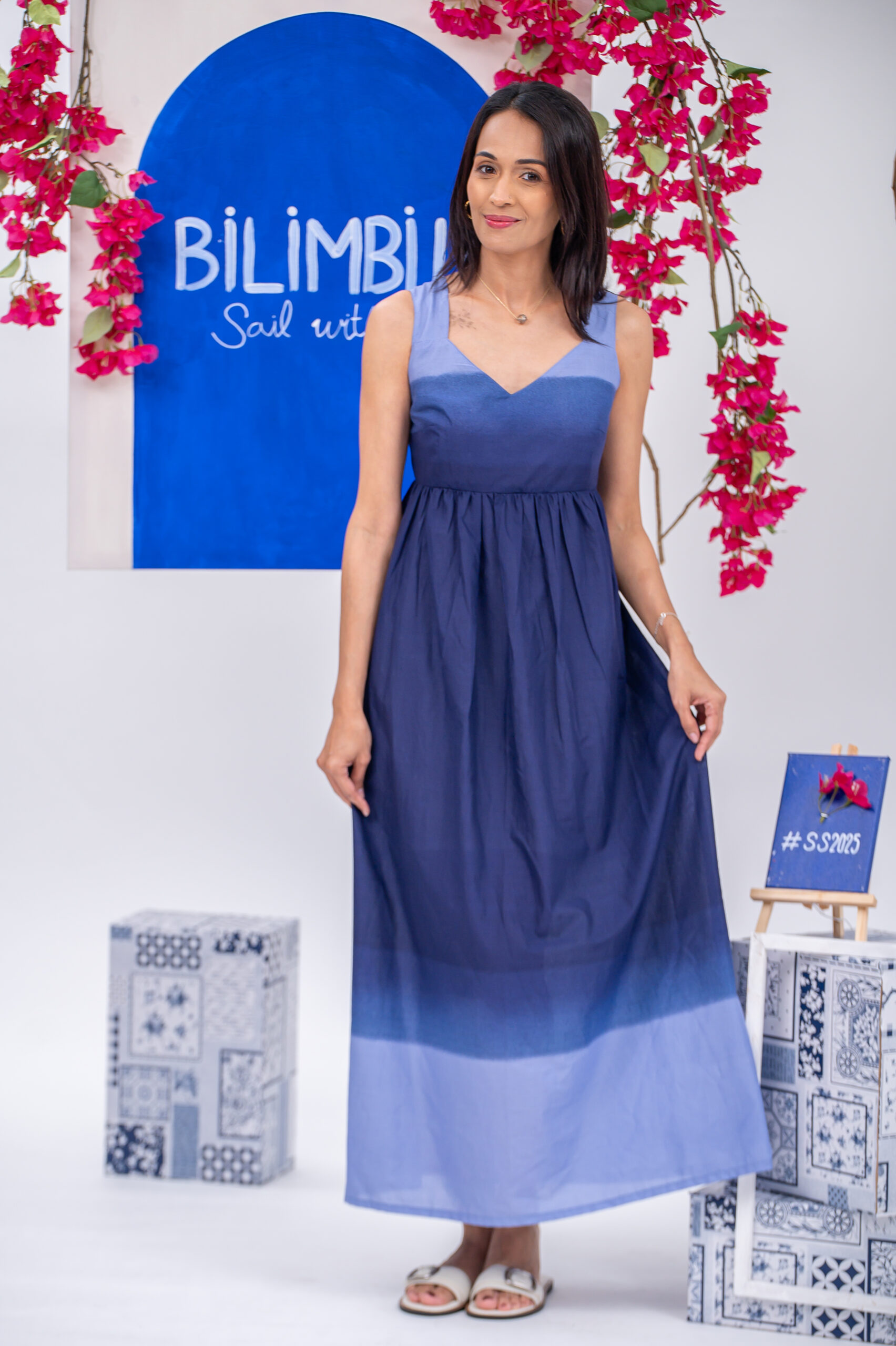 The Ella Dress flows with grace in a light sky-blue cotton, blooming with fuchsia, navy, and green florals or navy blue ombré. Its empire waist, sweetheart neckline, and sleeveless maxi cut flatter the silhouette while inviting movement. Feminine, fluid, and made to breathe — a summer essential that feels like air.