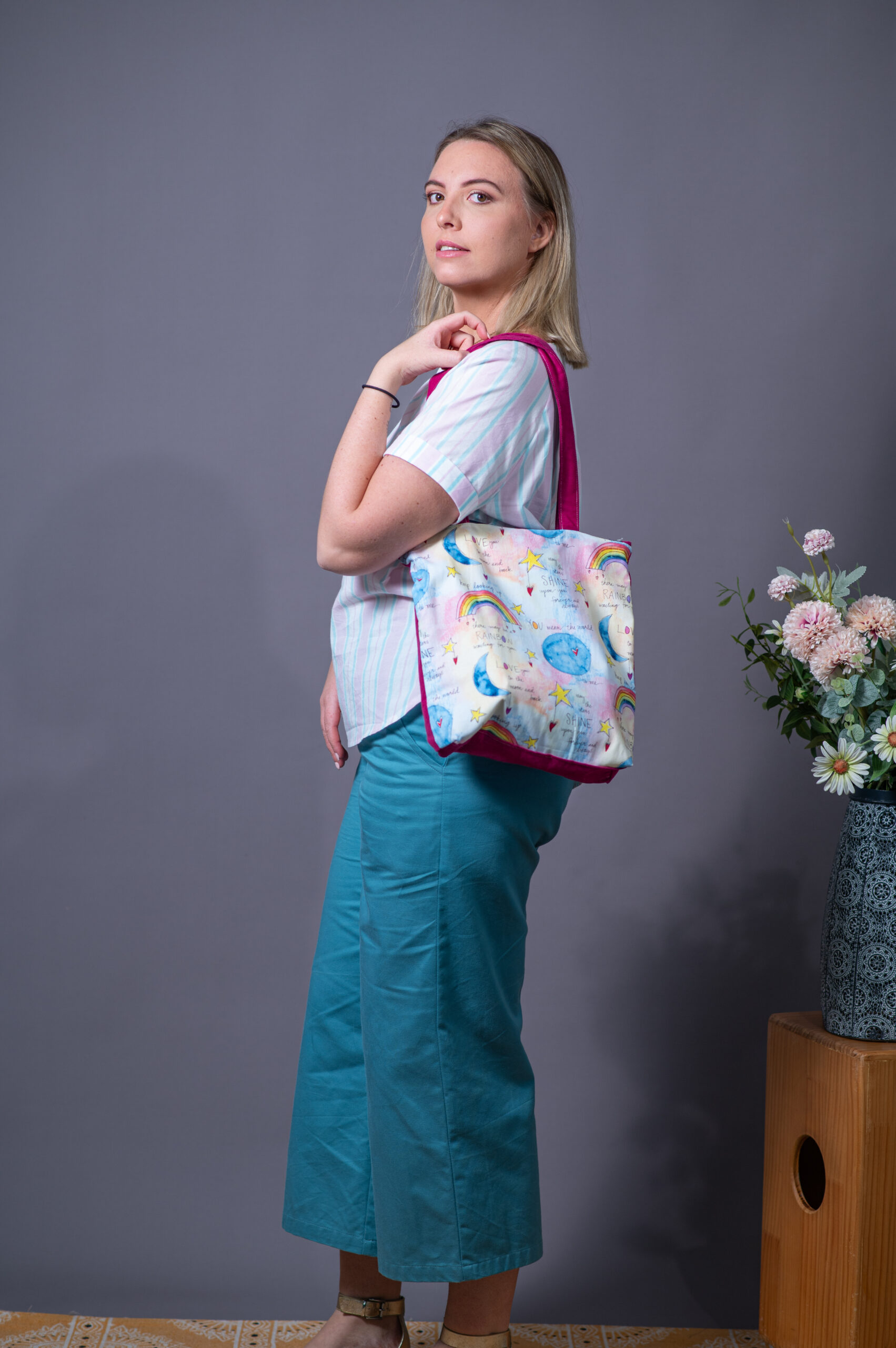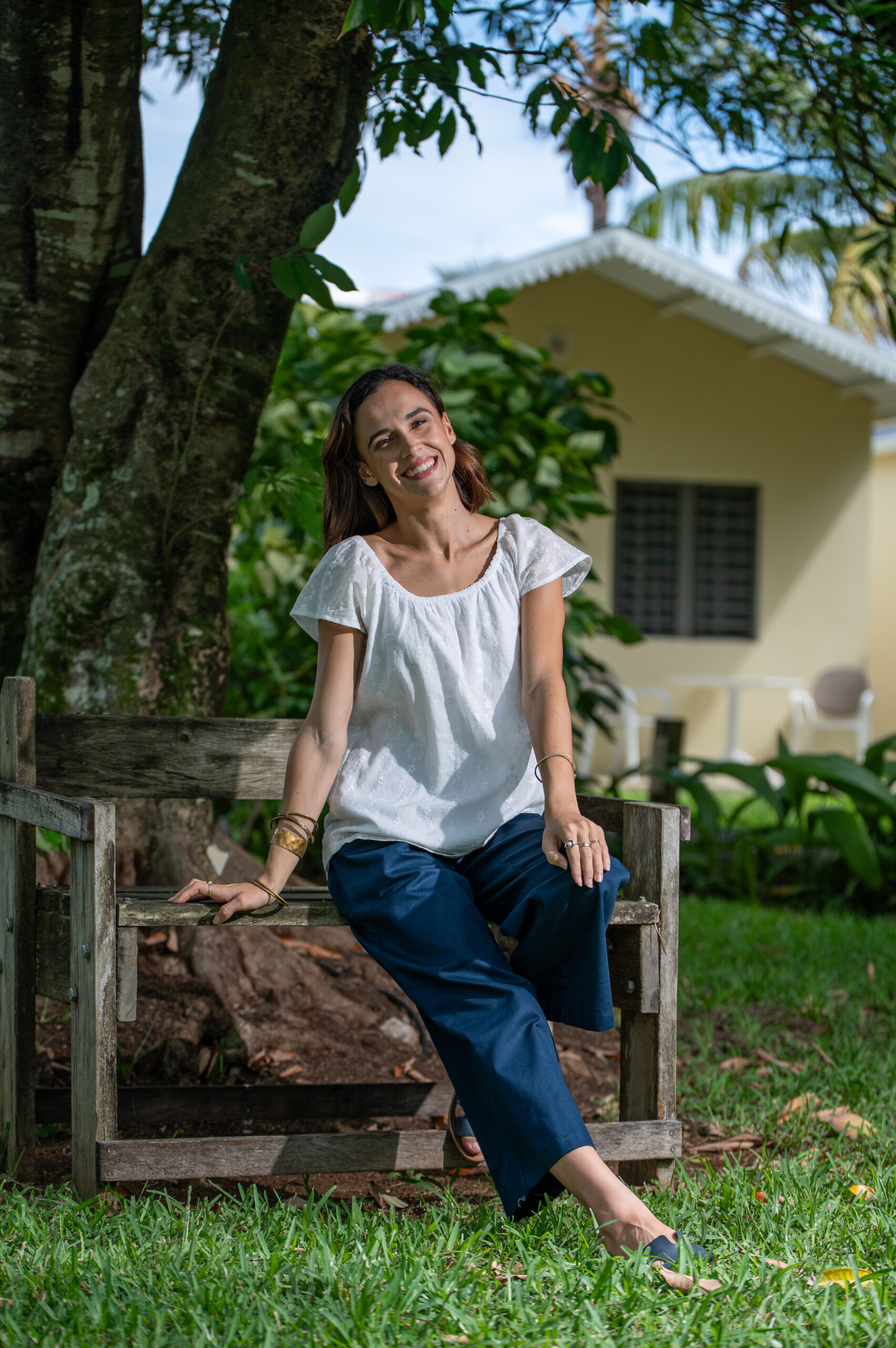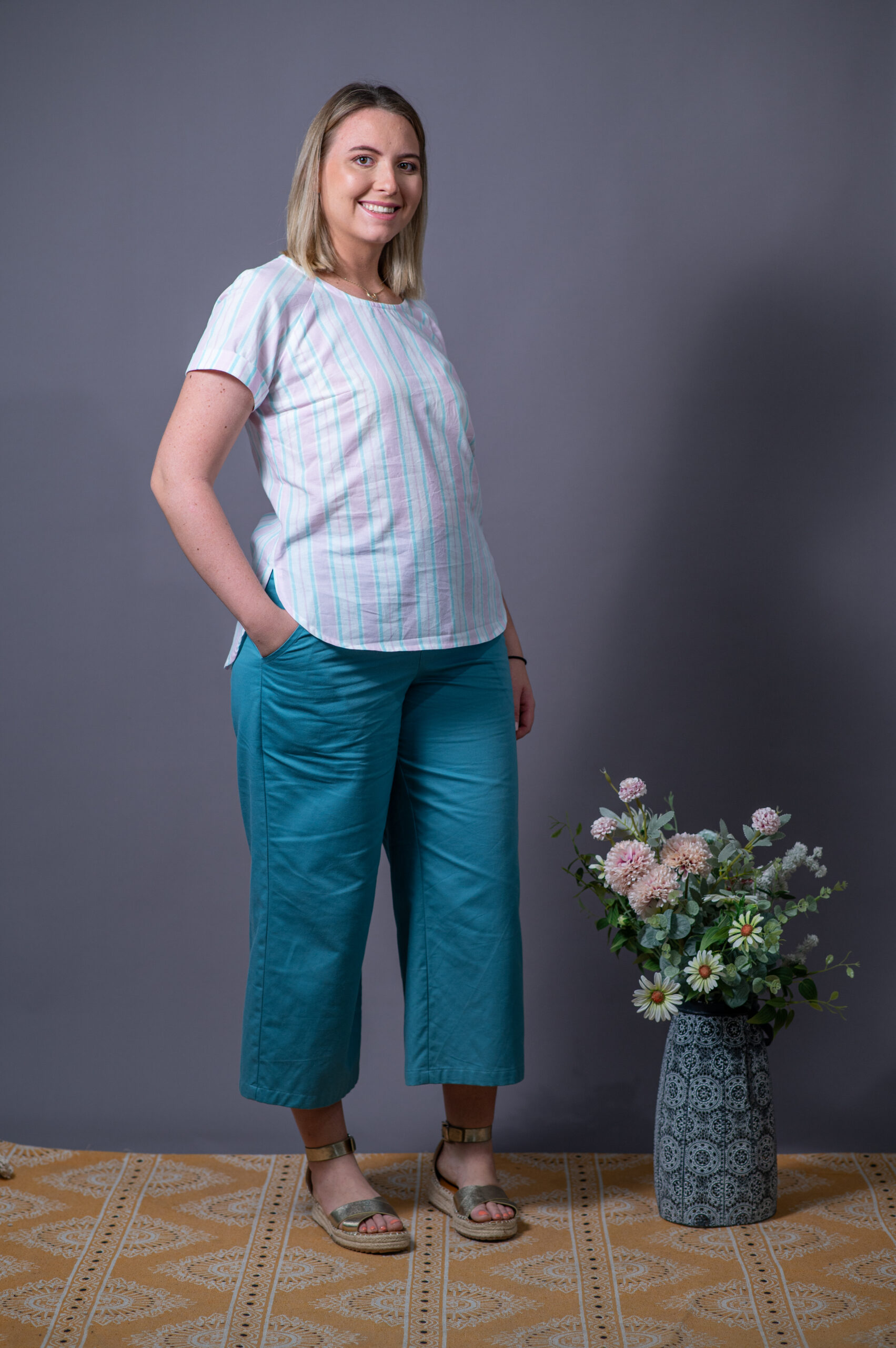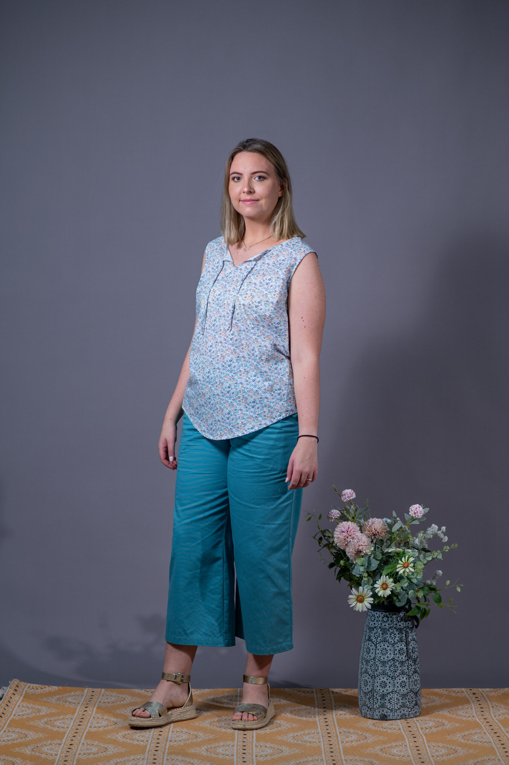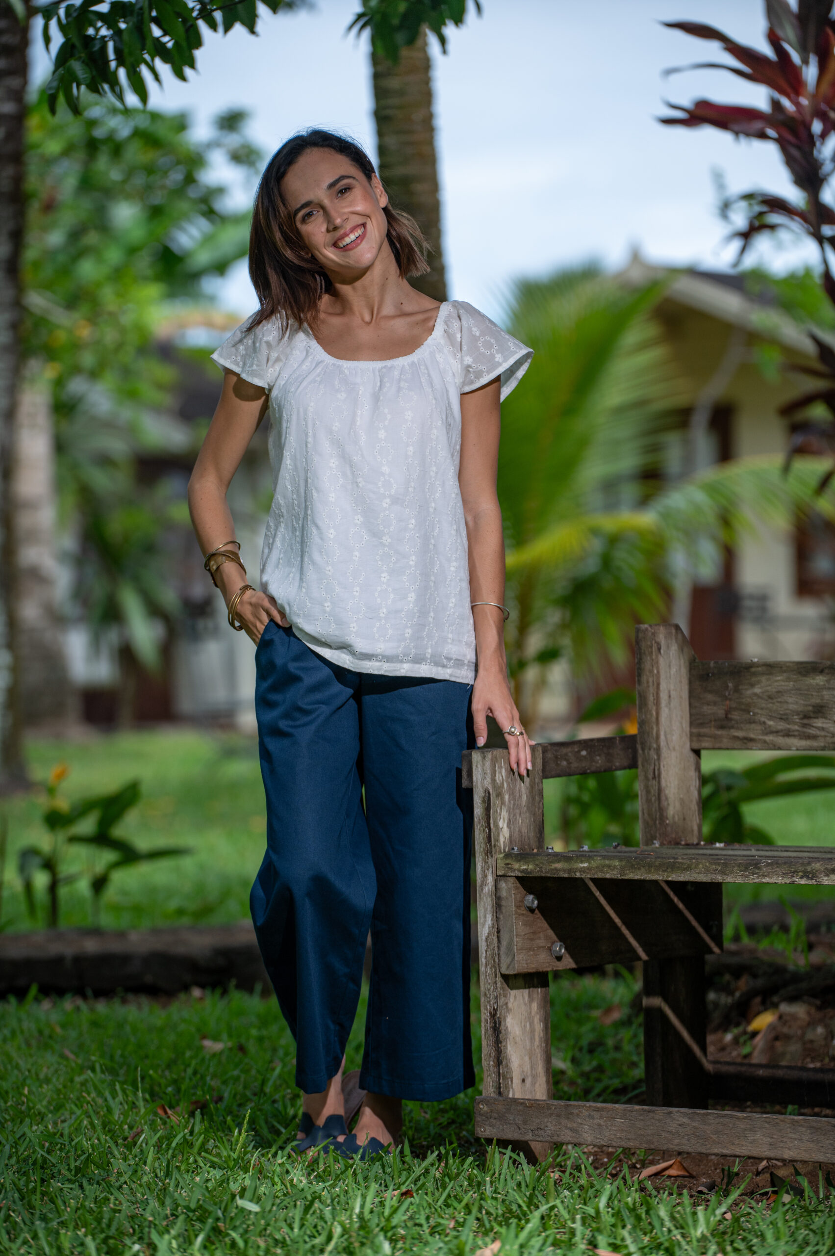 The Carmen Top is paired with our navy blue Fidou Pants, a flattering 7/8 length, and pockets for practicality and style.