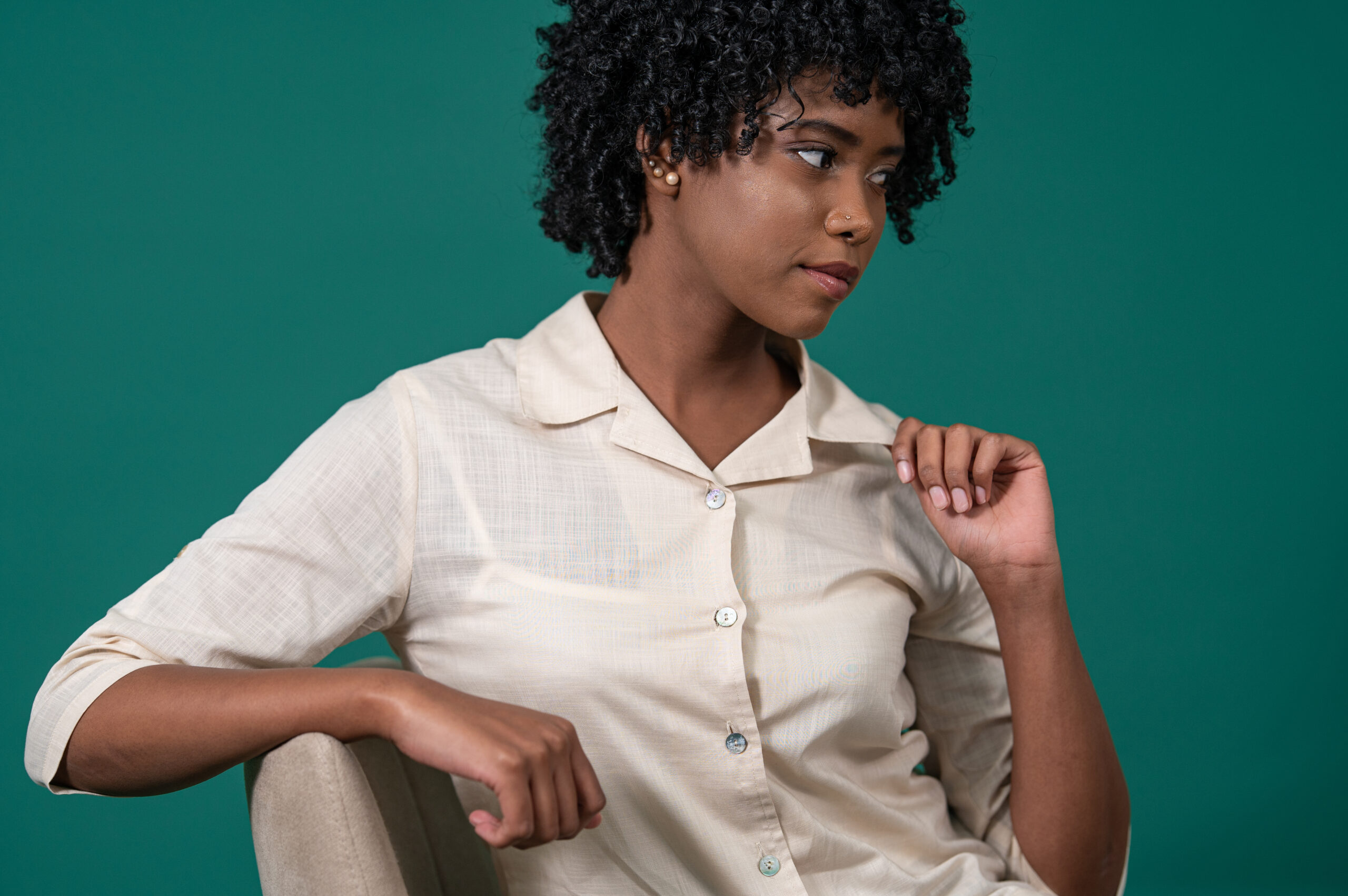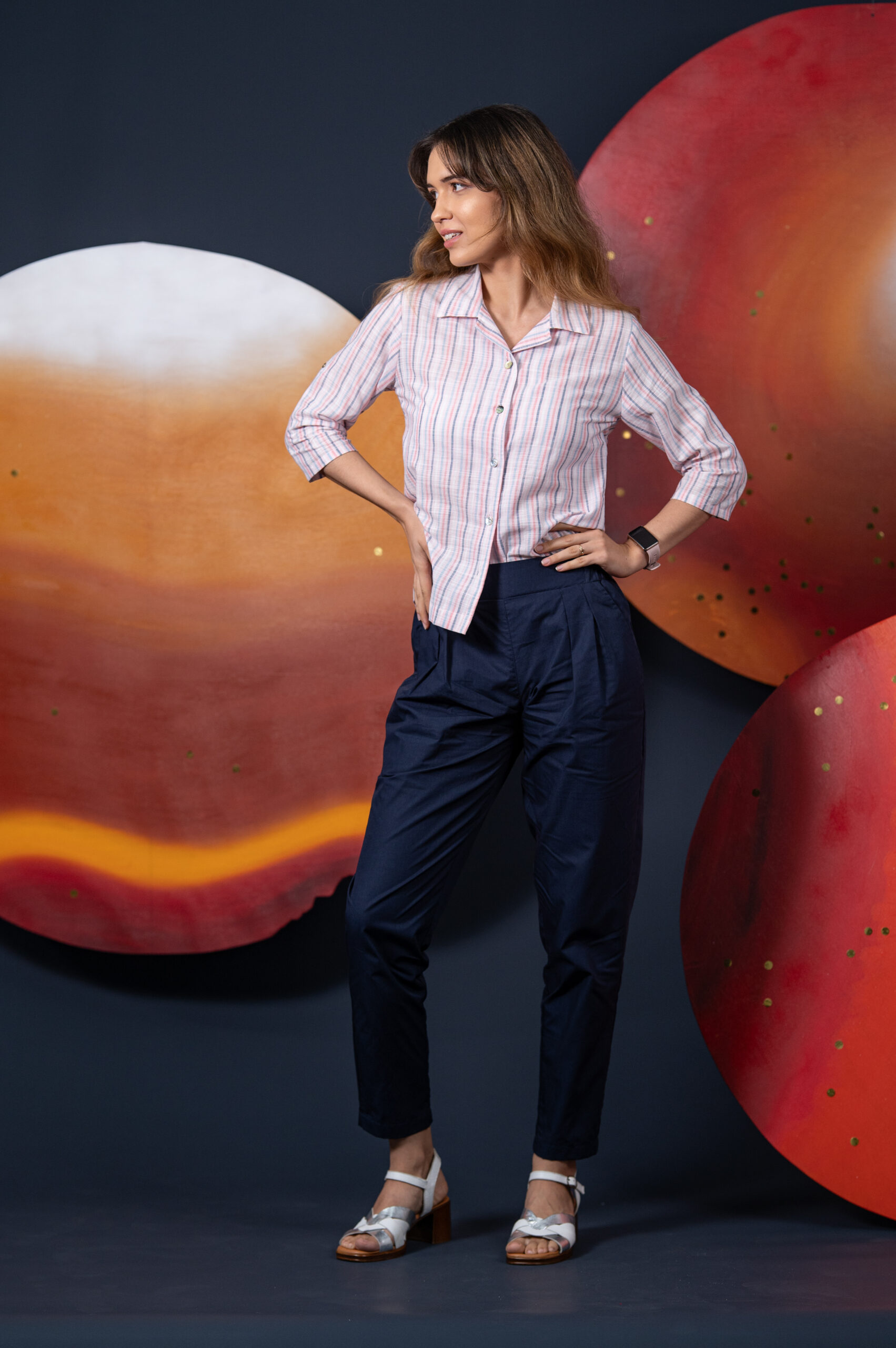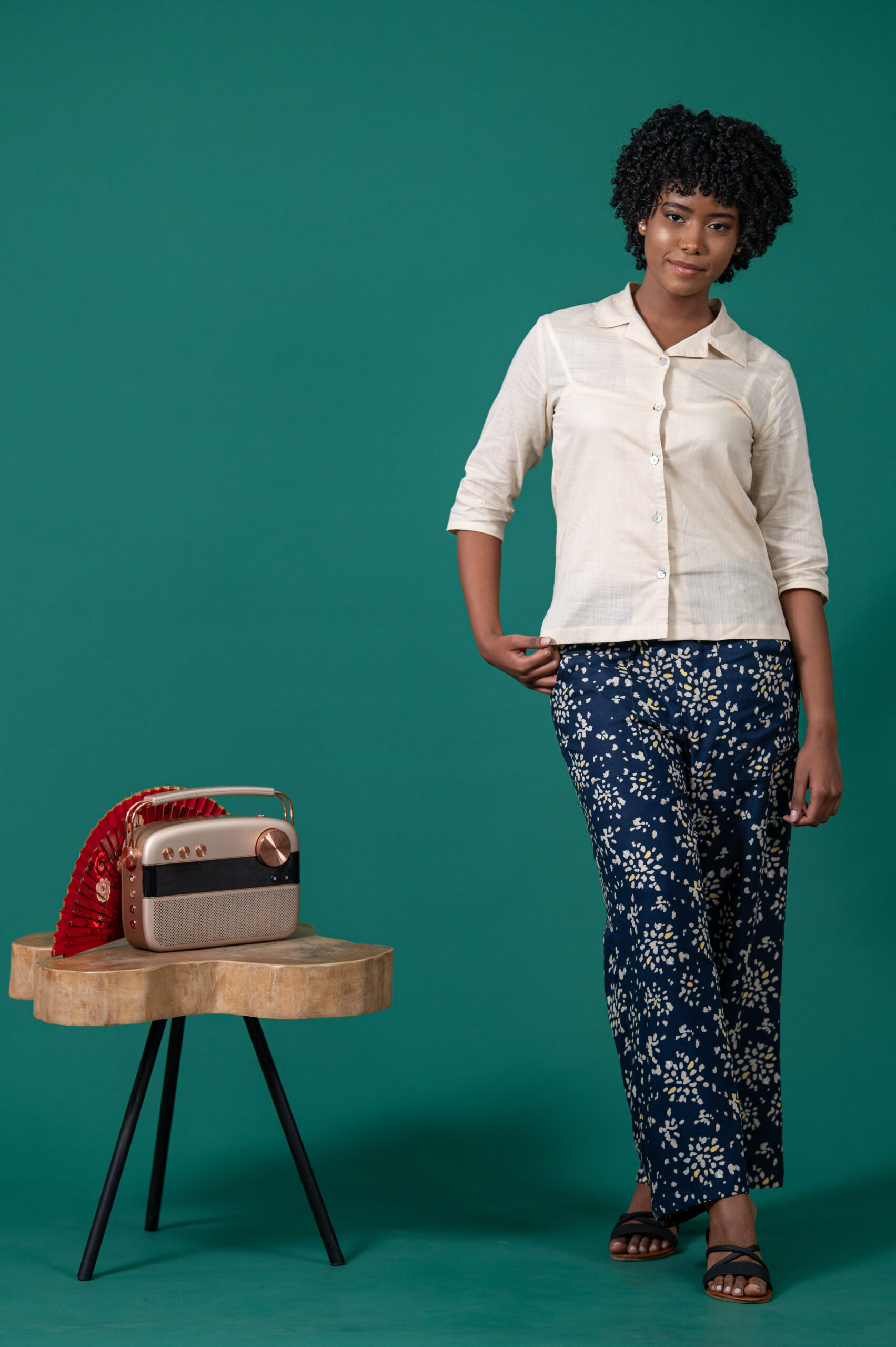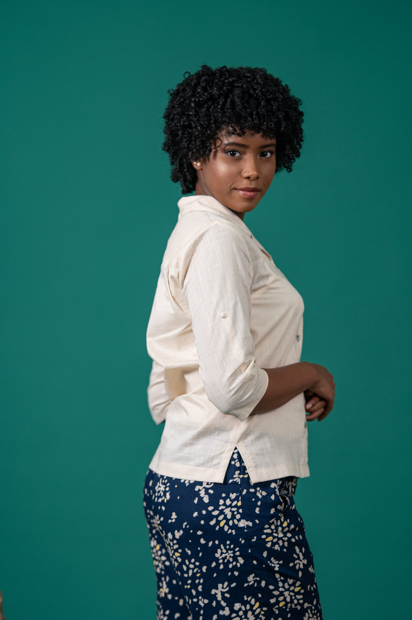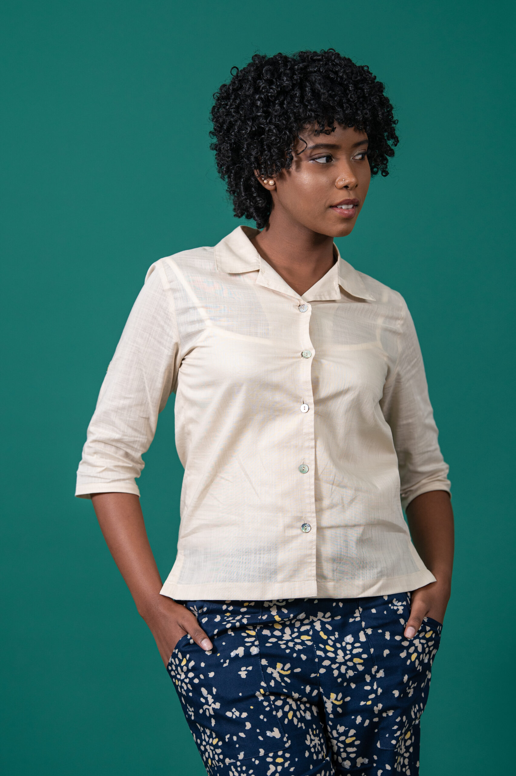The Jane shirt features a classic revere collar, three quarter sleeves with tab, and a relaxed fit.