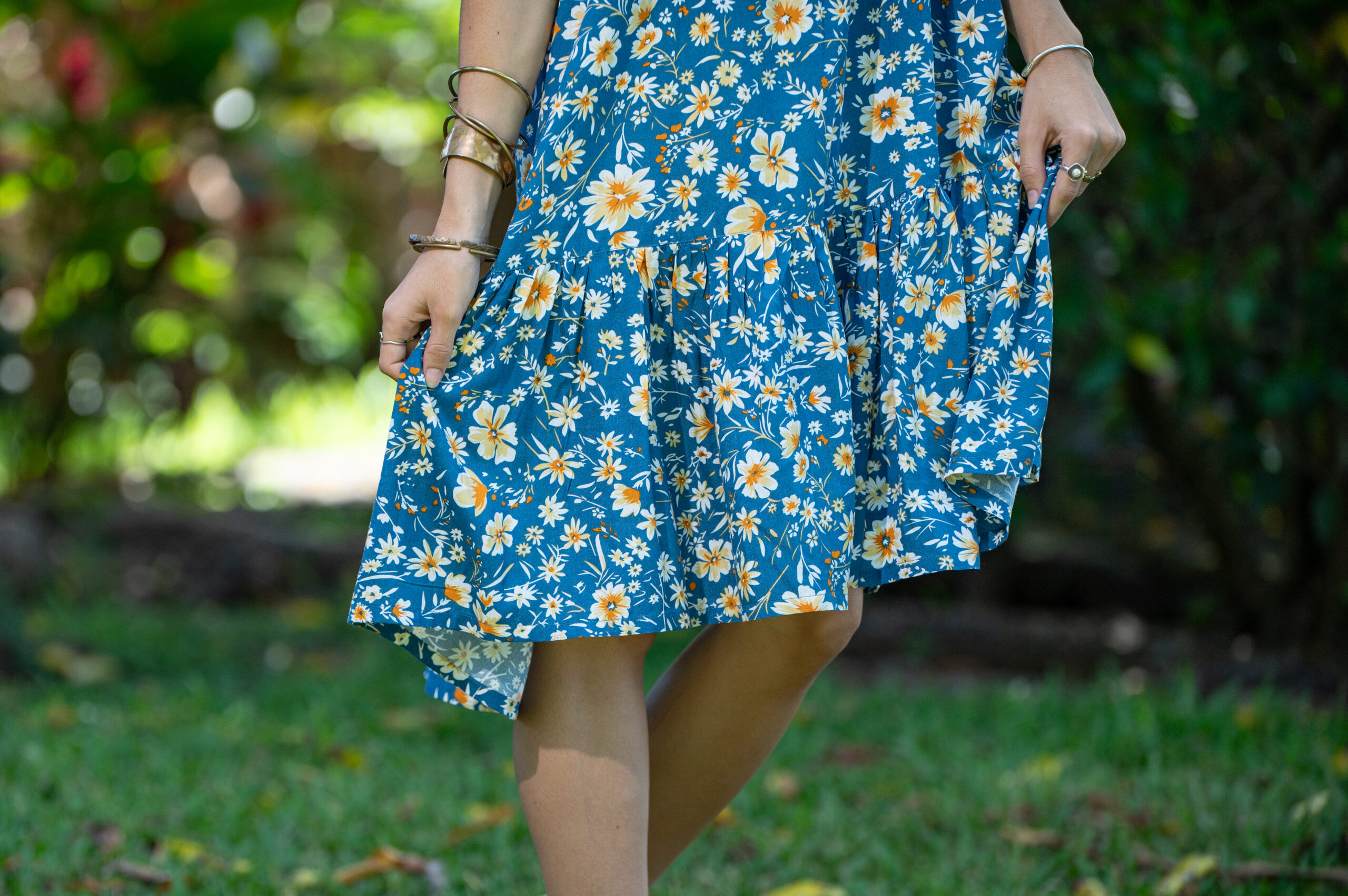blue with yellow and white floral print, red with white ditsy floral print