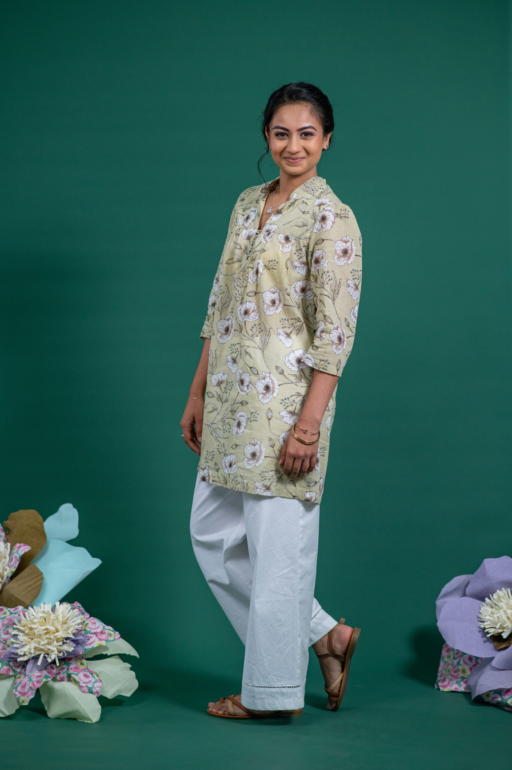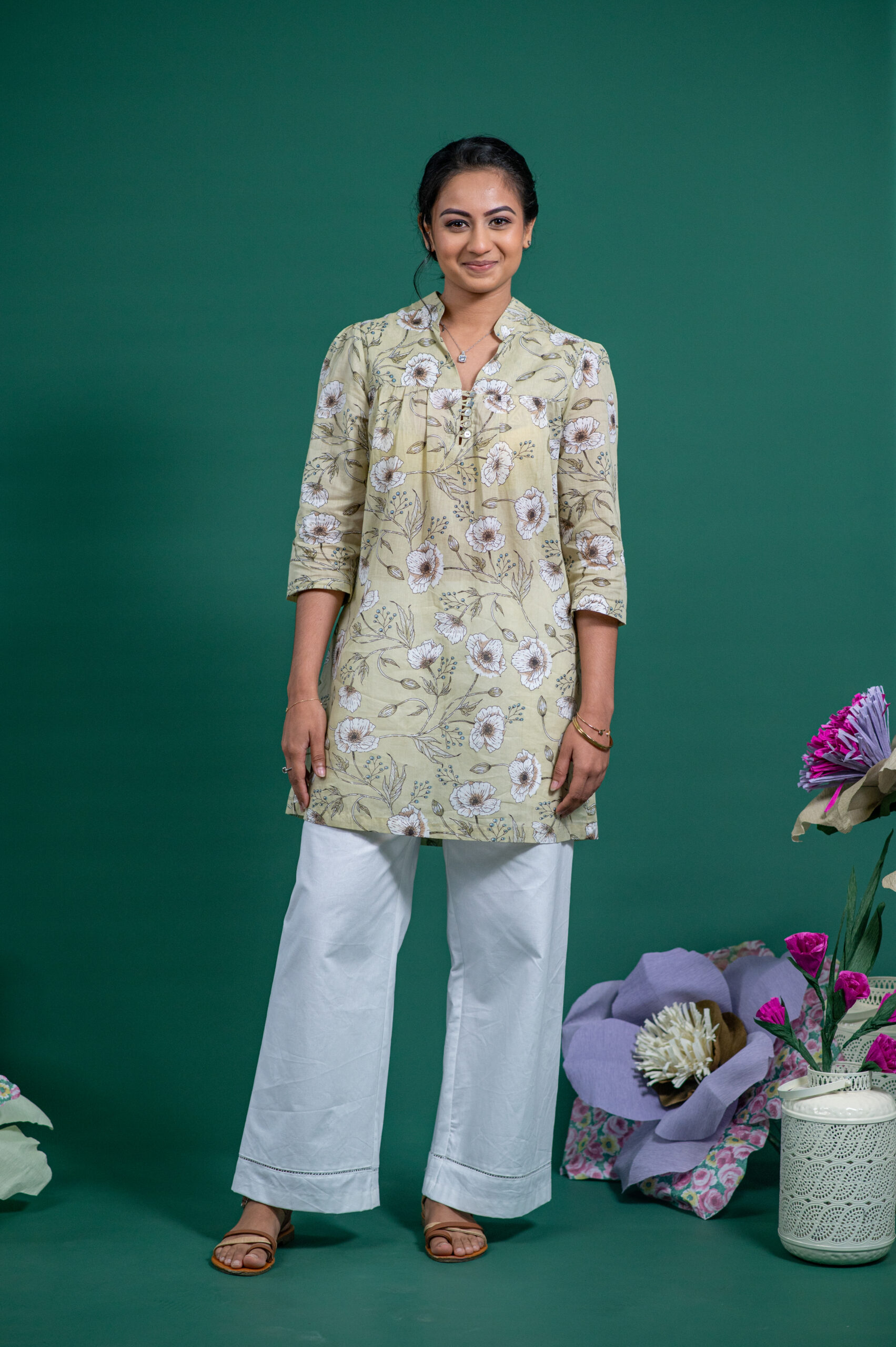 Crafted in a soft pistachio green cotton with subtle brown block-printed florals, it’s a piece that speaks quietly, yet beautifully.