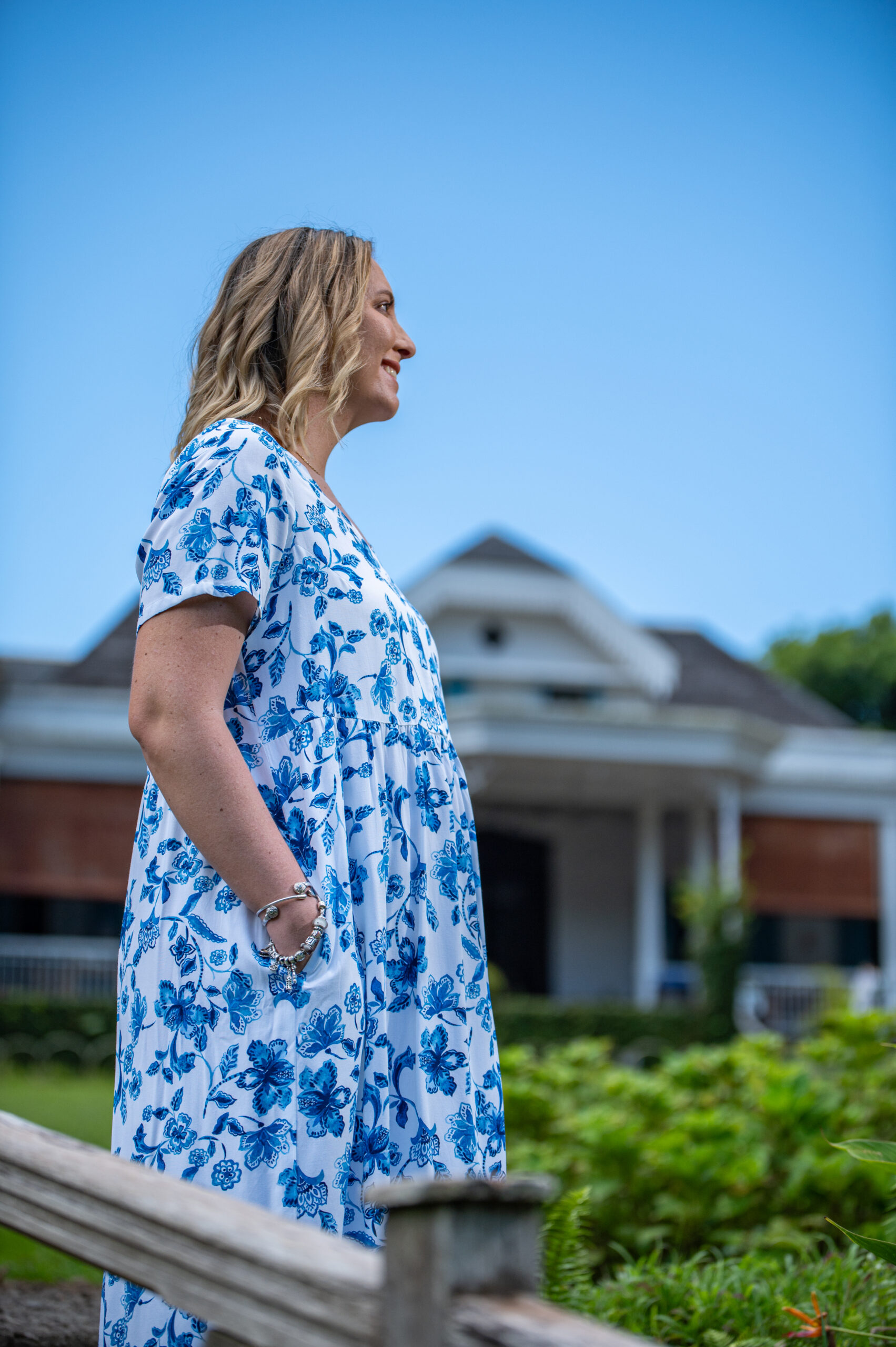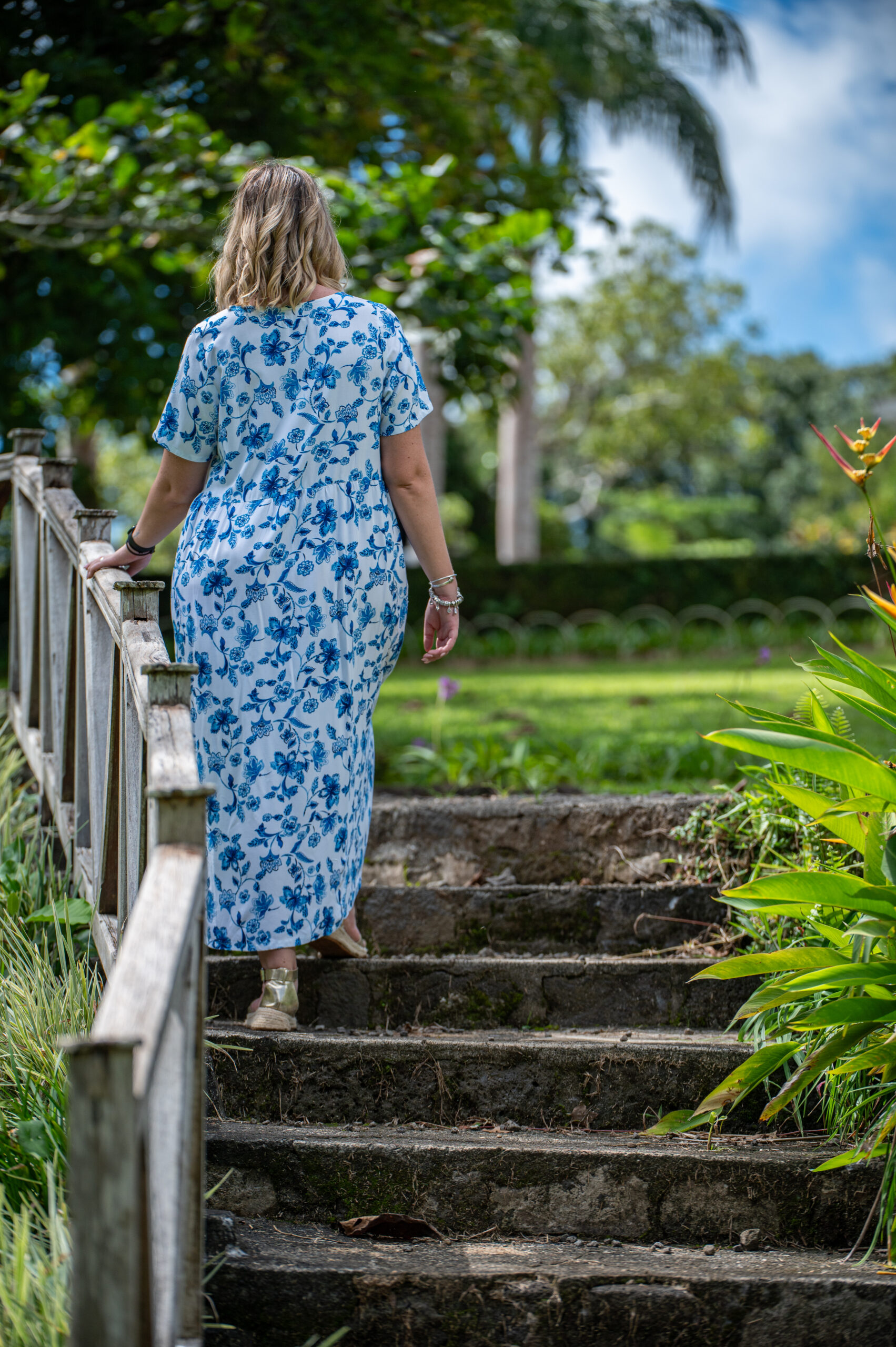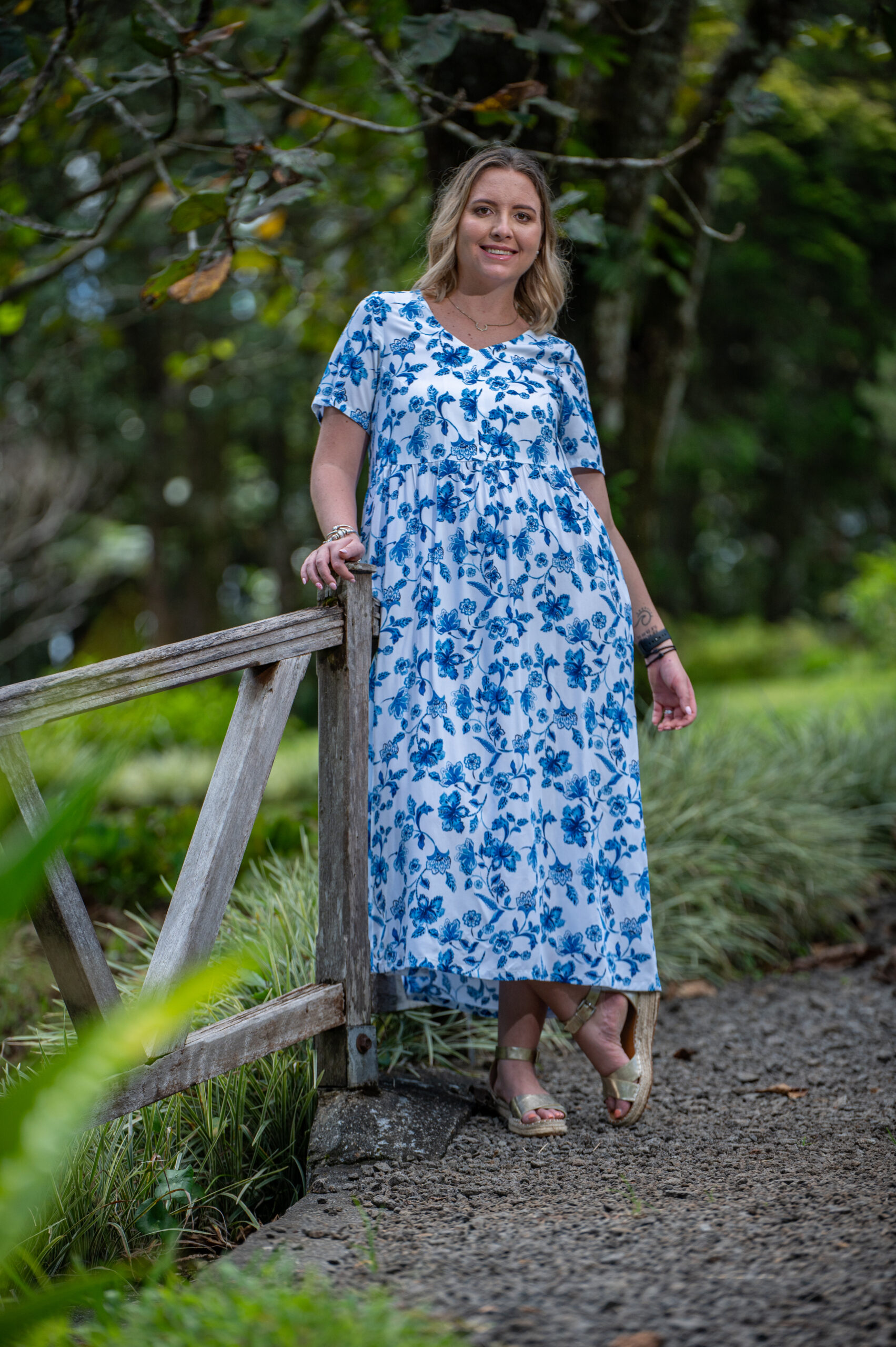 The Melanie Dress features a soft blue floral print on breathable cotton, with a flattering V-neckline bodice, a gathered skirt, and practical pockets. Its midi length and short sleeves make it the perfect piece for warm days, casual strolls, or slow Sunday mornings. Feminine, functional, and made to move with you.