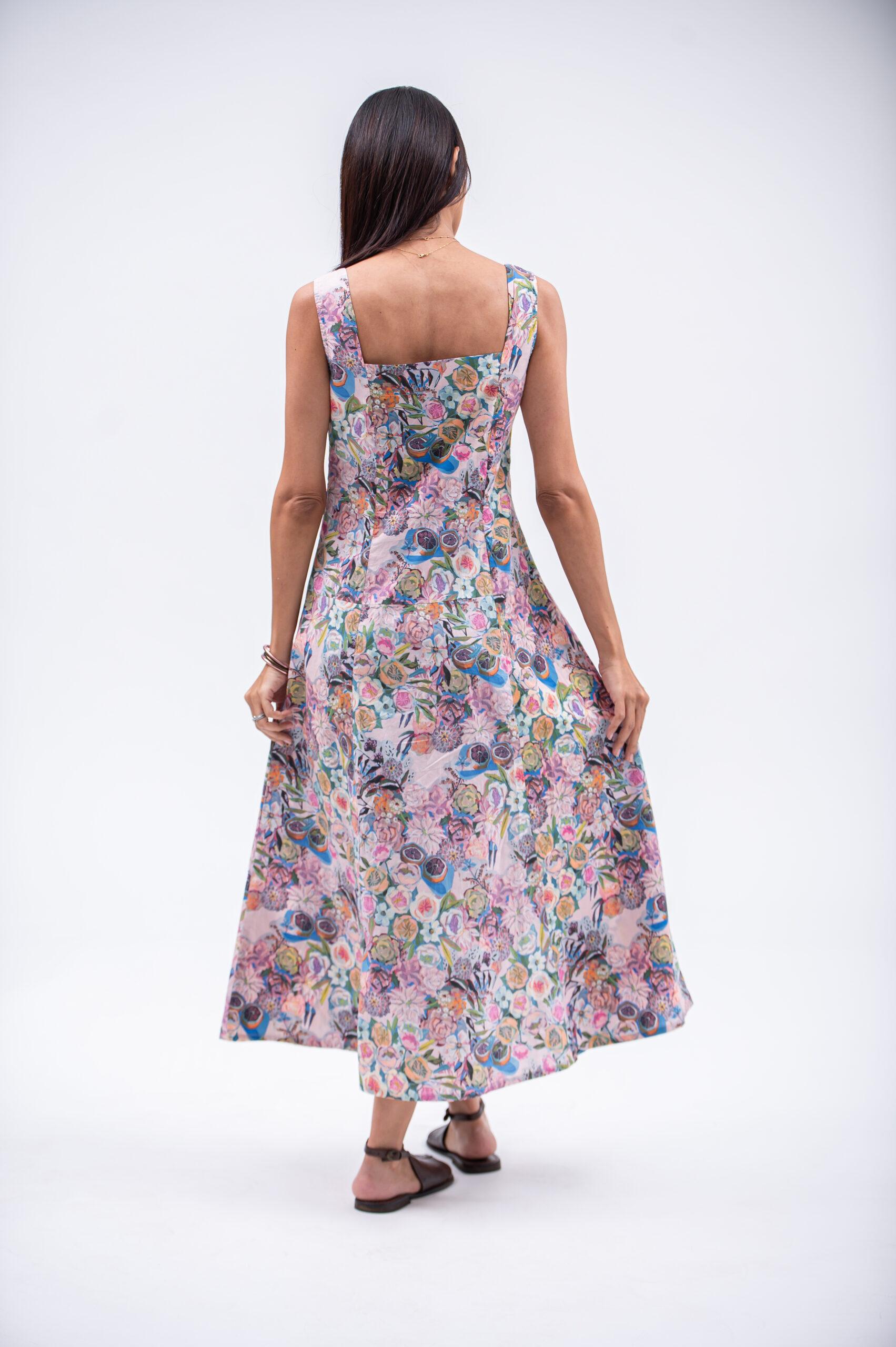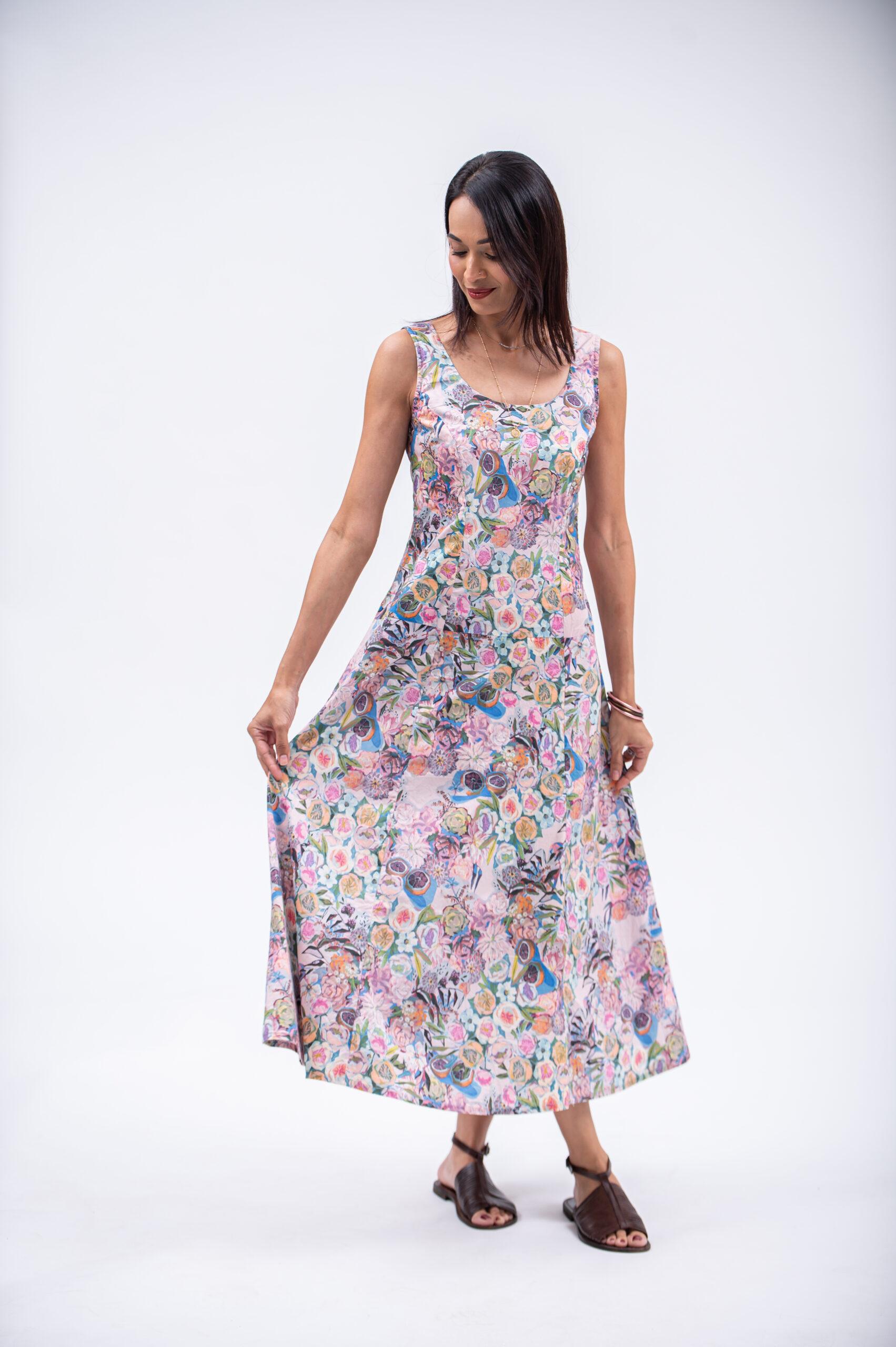 The Rosie dress is a sleeveless maxi dress in 100% printed cotton. Designed with princess lines for a flattering fit, it gently follows the silhouette before flaring softly at the hem. The dusty pink print adds a delicate, feminine touch, making it a light and comfortable dress for warm days and relaxed summer outings.