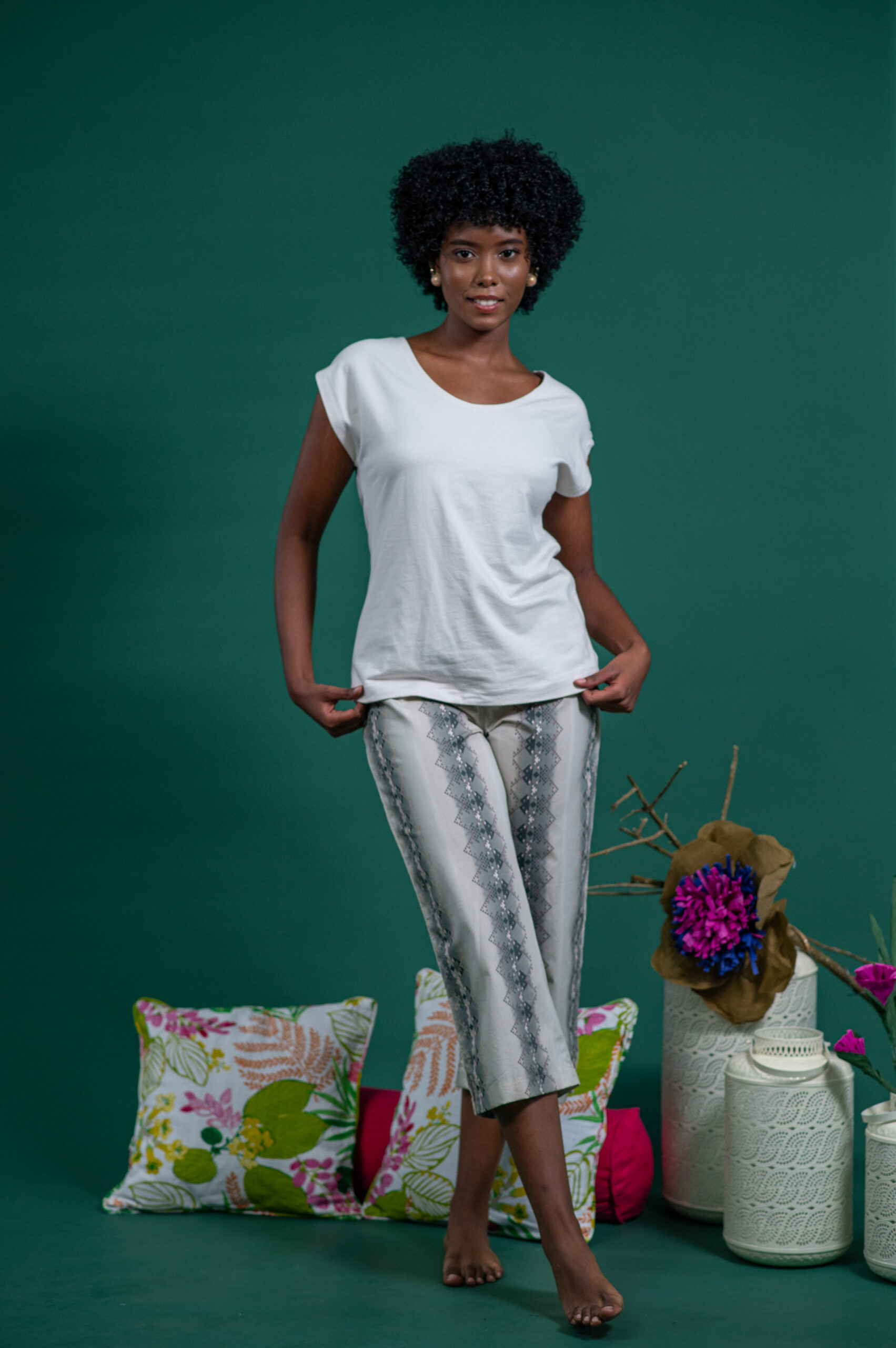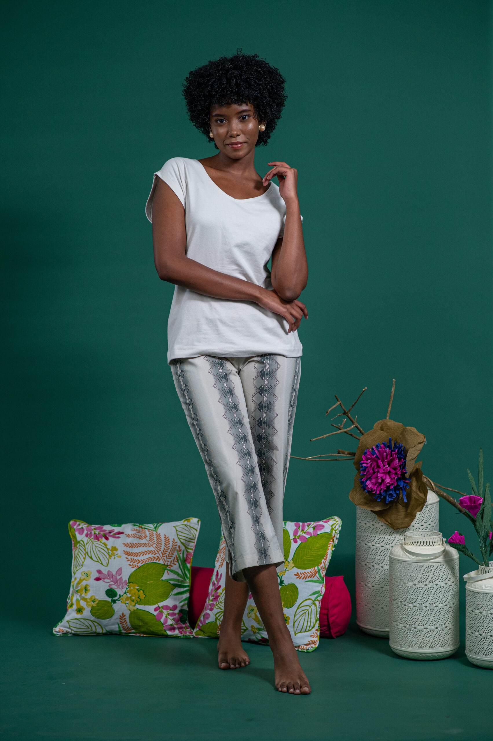 This cotton loungewear set pairs a soft, breathable T-shirt with relaxed-fit beige capri pants featuring a subtle khaki green stripe design. Easy to wear and effortlessly stylish, it’s your go-to for restful days, slow weekends, and moments just for you.