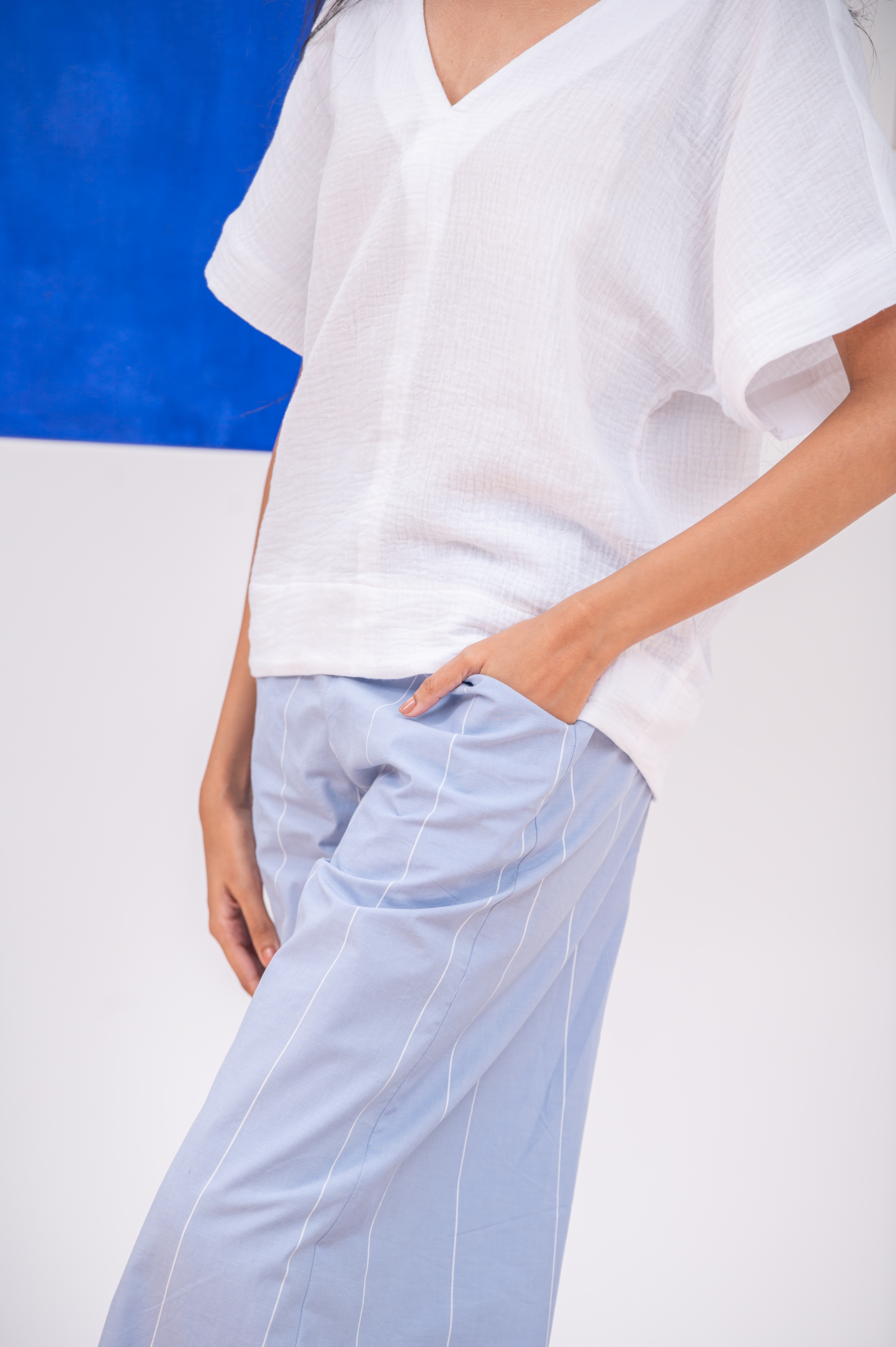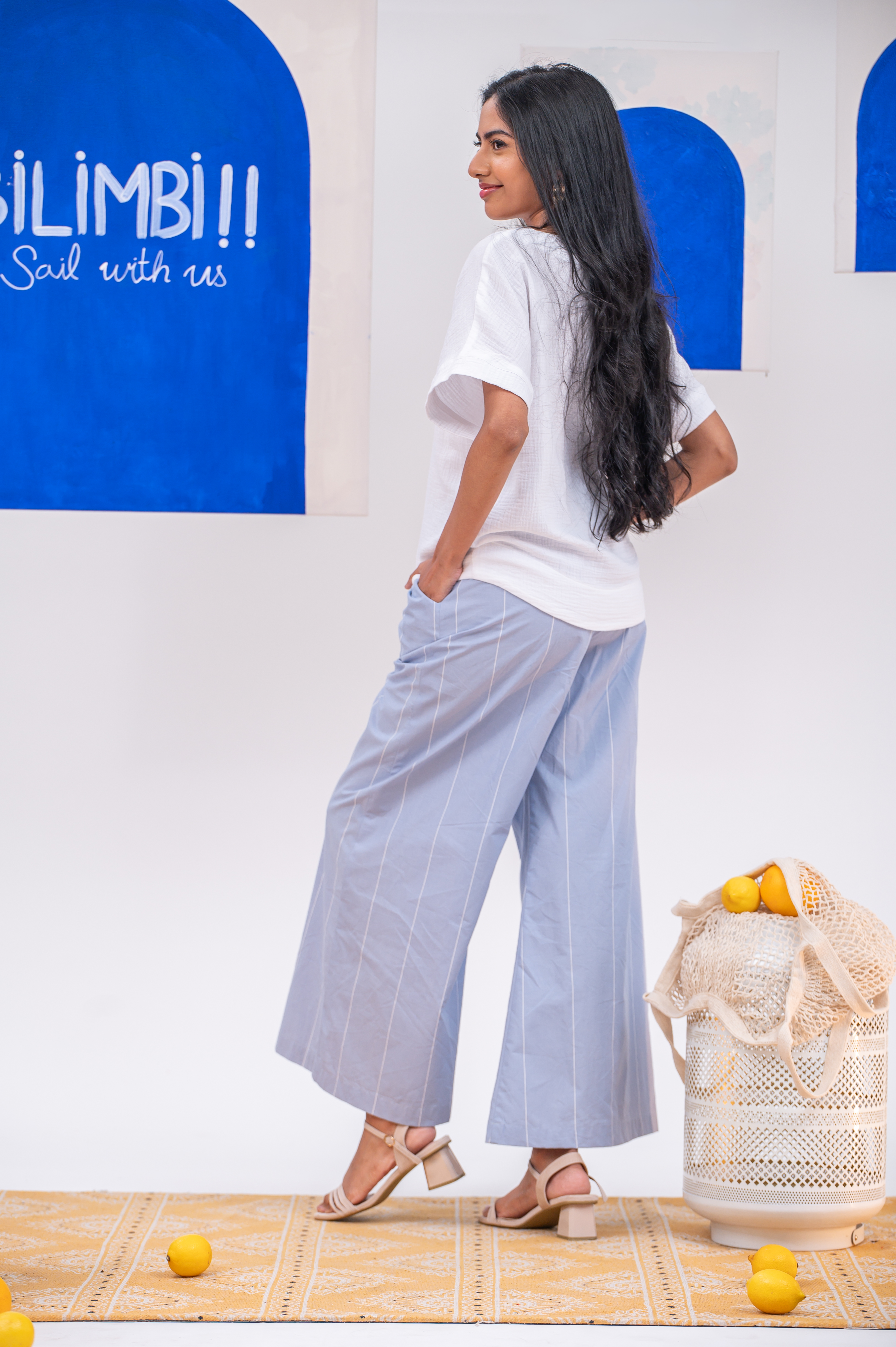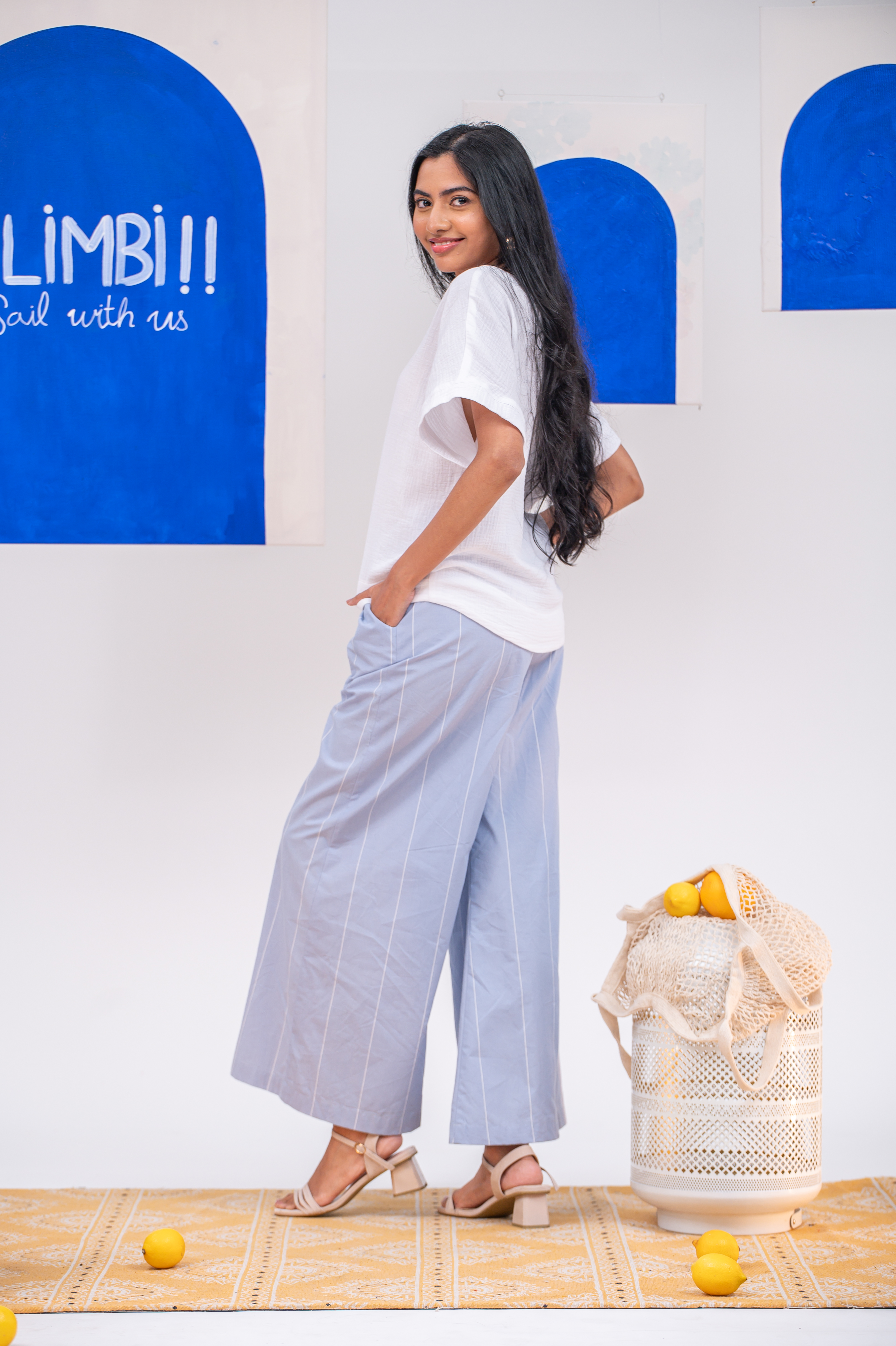 Wide-leg cotton pants in blue with white stripes, designed for effortless comfort. Featuring a pull-on waist with back elastic and practical side pockets — a light, breathable piece you’ll reach for every day.